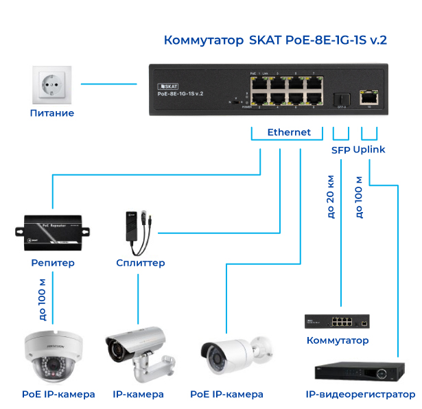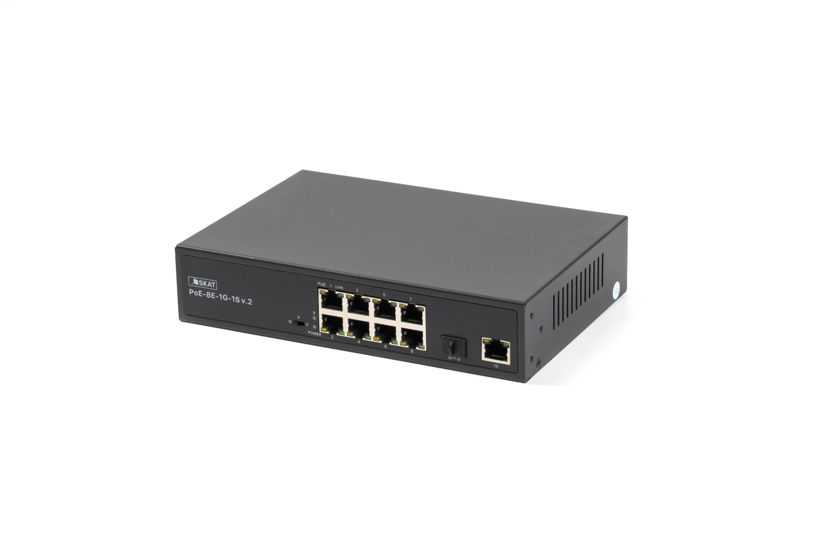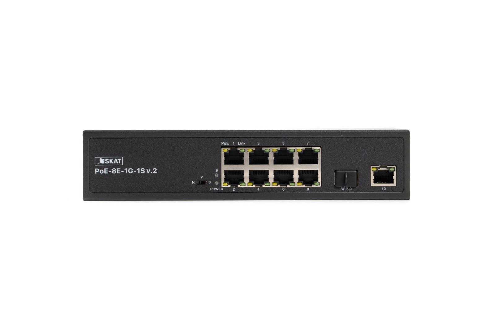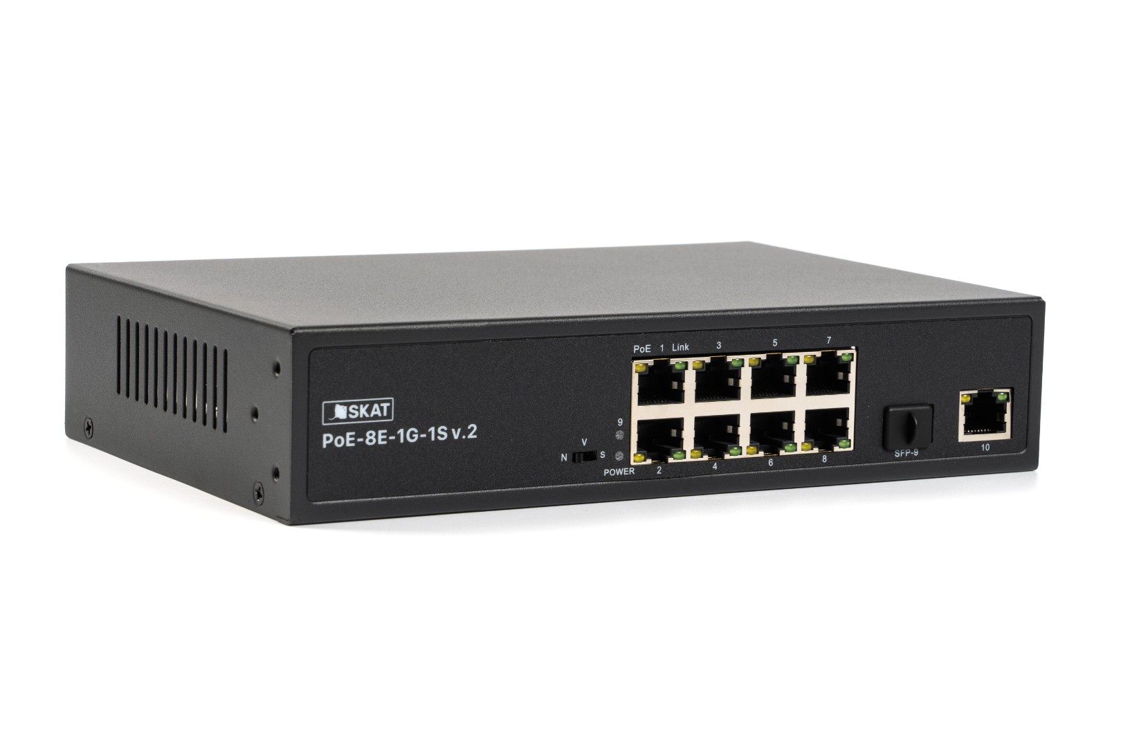 SKAT PoE-8E-1G-1S v.2 представляет собой специализированный неуправляемый PoE коммутатор для использования в системах видеонаблюдения и безопасности. Характеризуется высокой надежностью работы благодаря защите от электростатических разрядов и перепадов напряжения, позволяет организовать качественную передачу информации в сети Ethernet.
