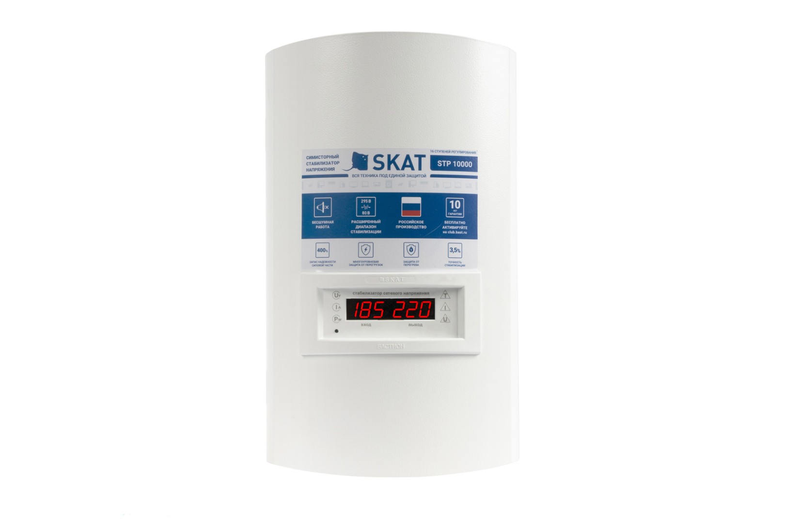 <div><h2>Технические характеристики <!-- -->SKAT STP-10000 исп. Н</h2><div><figure class="table"><table class="table table-bordered table-striped"><tbody><tr><td>Напряжение питающей сети 220 В, частотой 50+1 Гц, В</td><td style="text-align:center;">220</td></tr><tr><td>Рабочий диапазон входного напряжения, В</td><td style="text-align:center;">120...280</td></tr><tr><td>Рабочий диапазон выходного напряжения, В</td><td style="text-align:center;">212...228</td></tr><tr><td>Предельный диапазон входного напряжения, В</td><td style="text-align:center;">80...295*</td></tr><tr><td>Точность стабилизации, %</td><td style="text-align:center;">3.5</td></tr><tr><td>Количество ступеней стабилизации, шт.</td><td style="text-align:center;">16</td></tr><tr><td>Ток нагрузки (i ном) , А, не более</td><td style="text-align:center;">27</td></tr><tr><td>Номинальная мощность нагрузки, ВА, не более</td><td style="text-align:center;">6500</td></tr><tr><td>Максимальная, пиковая мощность нагрузки, ВА, не более</td><td style="text-align:center;">10000**</td></tr><tr><td>Среднее время переключения, мс, не более</td><td style="text-align:center;">10</td></tr><tr><td>Мощность, потребляемая от сети без нагрузки, ВА, не более</td><td style="text-align:center;">34</td></tr><tr><td>Максимальное сечение провода, зажимаемого в клеммах колодки, мм2</td><td style="text-align:center;">10</td></tr><tr><td>Габаритные размеры ШхВхГ (без/с упаковкой), мм, не более</td><td style="text-align:center;">270x460x200/ 355x565x262</td></tr><tr><td>Macca, HETTO (БРУТТО), кг, не более</td><td style="text-align:center;">19(21)</td></tr><tr><td>Степень защиты оболочкой по 14254-2015</td><td style="text-align:center;">ІР20</td></tr><tr><td>Диапазон рабочих температур</td><td style="text-align:center;">-10...+40</td></tr></tbody></table></figure><p>Примечание: Номиналы напряжений указаны с допуском ±2В.</p><p>*Режим работы с расширенным диапазоном сетевого напряжения.</p><p>**В течение 20 секунд.</p></div></div>