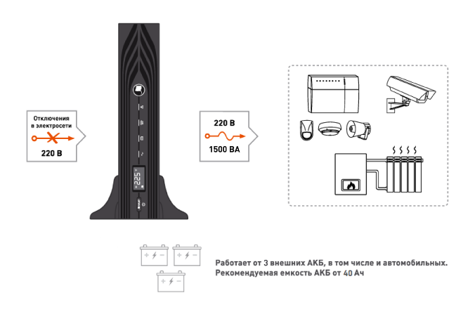 - качественное, бесперебойное, эффективное и надёжное питание нагрузок с номинальным напряжением питания 220 В переменного тока и суммарной потребляемой мощностью до 1500 ВА;