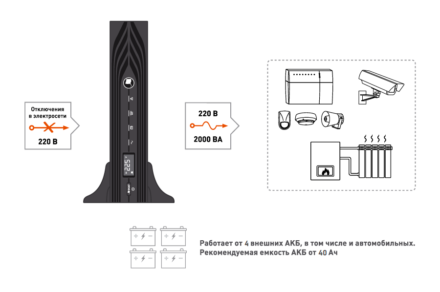 - качественное, бесперебойное, эффективное и надёжное питание нагрузок с номинальным напряжением питания 220 В переменного тока и суммарной потребляемой мощностью до 2000 ВА;