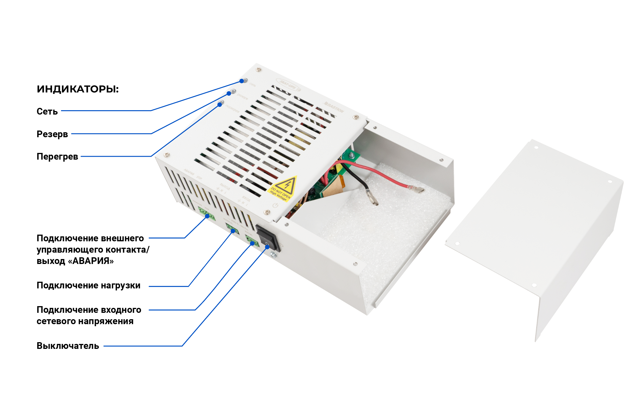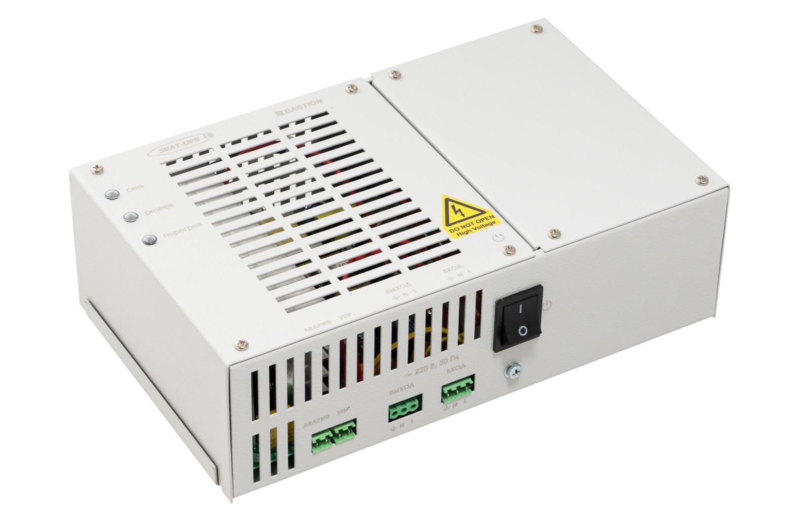 В случае отключения электроэнергии источник продолжает питать оборудование за счёт встроенной аккумуляторной батареи ёмкостью 7 Ач.
