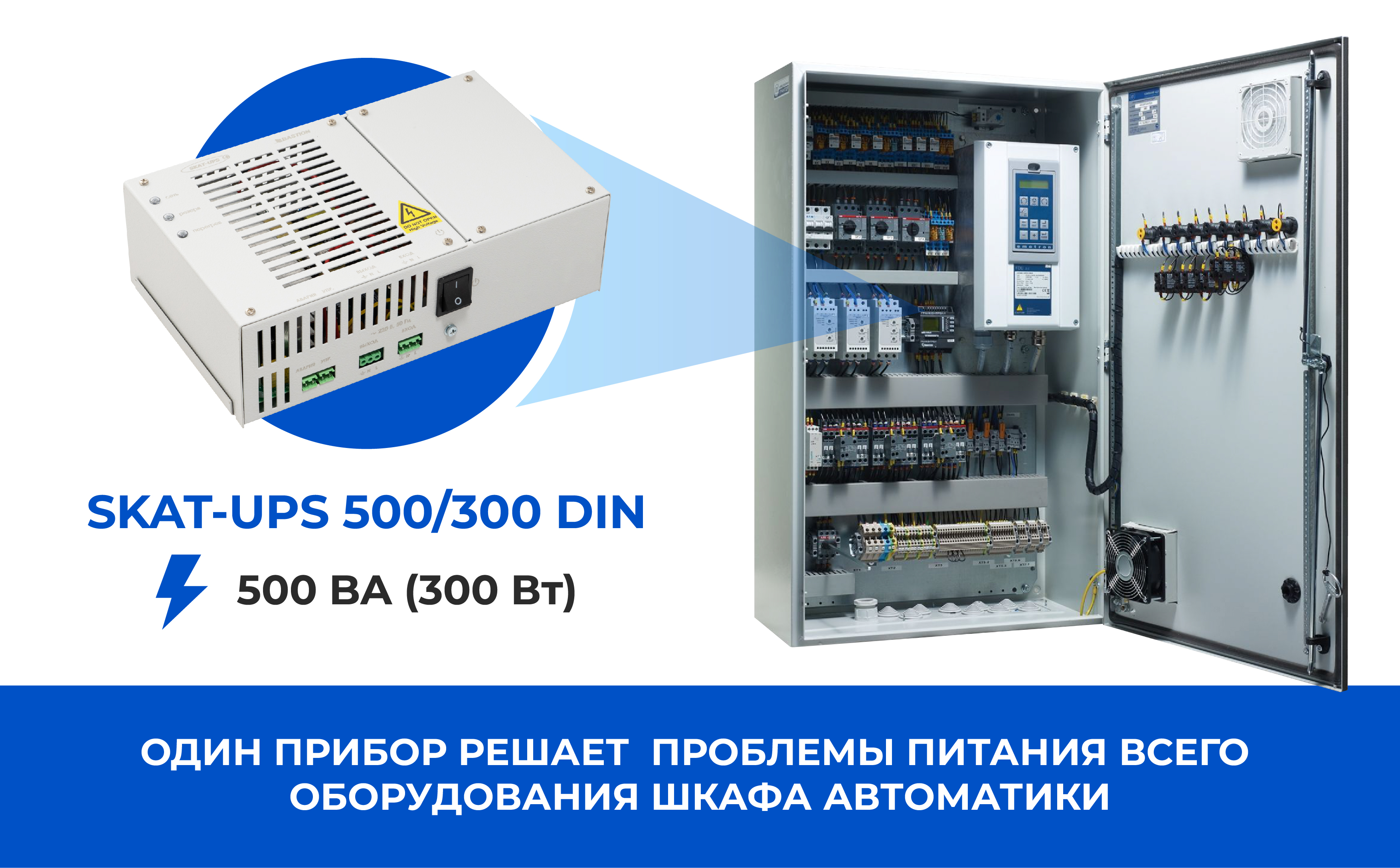 Источник бесперебойного питания SKAT-UPS 500/300-DIN-IN предназначен для обеспечения качественным электропитанием оборудования промышленной автоматики мощностью до 500 ВА.
