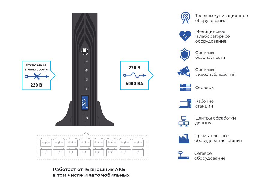 - качественное, бесперебойное, эффективное и надёжное питание нагрузок с номинальным напряжением питания 220 В переменного тока и суммарной потребляемой мощностью до 6 кВА;