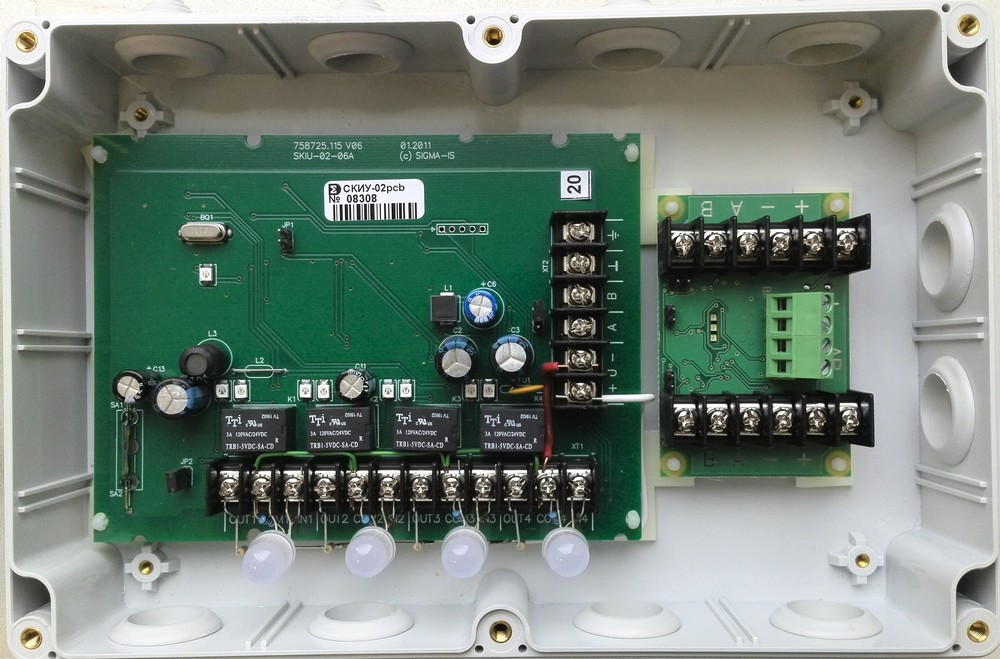 Сетевой контроллер исполнительных устройств с контролем цепей управления, 4 реле Form A, 30В, 2А, 2 ввода питания, 2 линии связи RS-485, корпус IP54