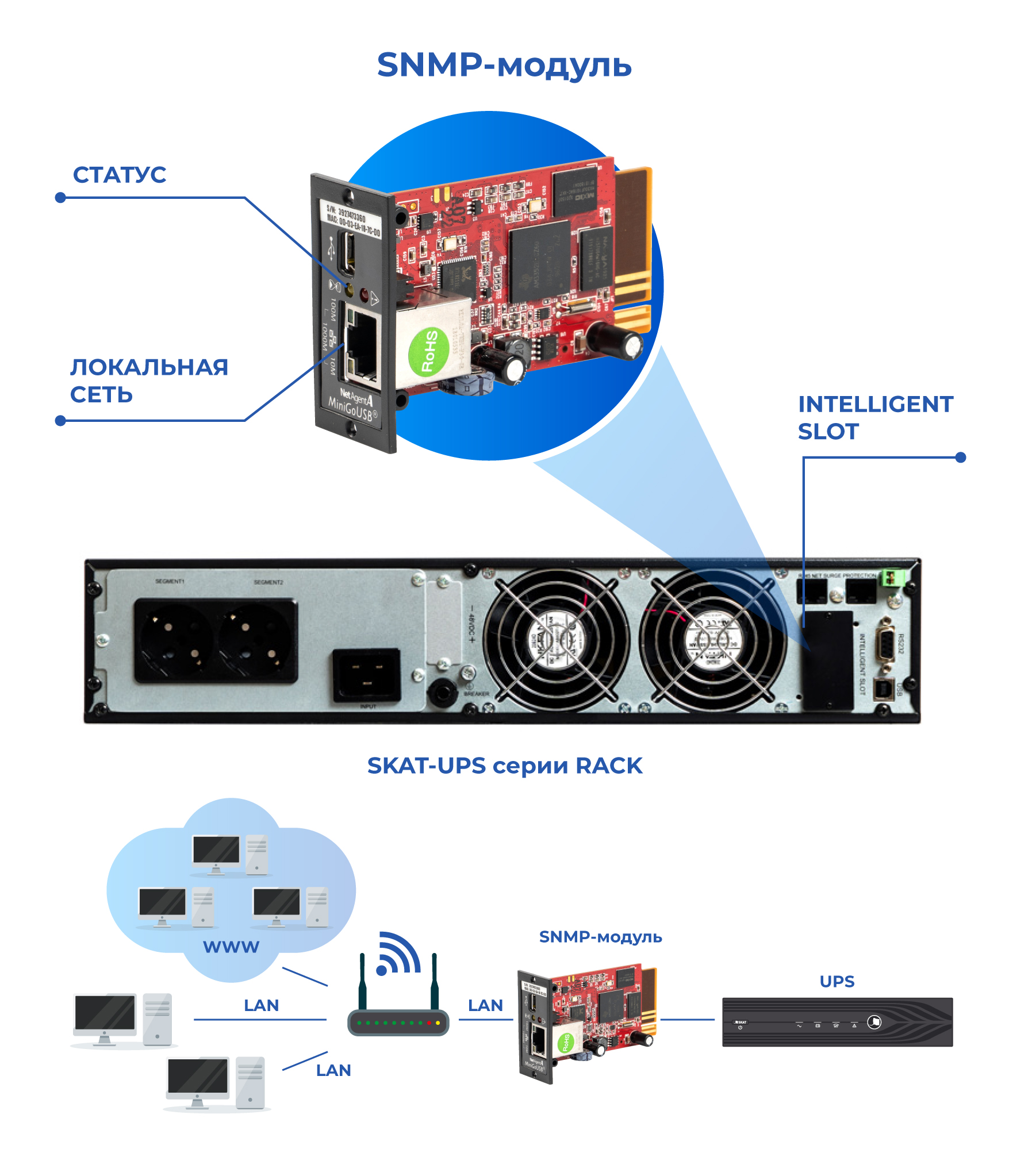 SNMP-модуль предназначен для SKAT-UPS серии RACK мощностью от 1000 ВА до 10000 ВА и SKAT-UPS серии 3/3 от 10 до 40 кВА. Обеспечивает мониторинг и управление ИБП в компьютерной сети с обеспечением автоматического корректного завершения работы серверов и рабочих станций. Имеет функцию автоопределения 10M/100M Fast Ethernet. Управление и конфигурация осуществляется через Telnet, Web-браузер или NMS. Поддержка протоколов TCP/IP, UDP, SNMP, Telnet, SNTP, PPP, HTTP, SMTP.