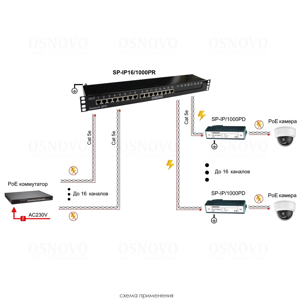 1U устройство грозозащиты для локальной вычислительной сети на 16 портов (скорость до 1000 Мб/с) с защитой линий PoE (af/at/bt, методы A + B, контакты 1/2, 3/6, 4/5, 7/8). Двухступенчатая защита. Максимальное длительное рабочее напряжение (Uс) DC58V. Номинальный ток разряда (8/20 мкс, In) 2,5kA. Суммарный ток разряда (8/20 мкс, Itotal) 20kA. Время отклика 1нс. 16 входов (RJ45-мама), 16 выходов (RJ45-мама). Монтаж в 19" стойку (1U). Размеры (ШхВхГ): 487x44,5x102мм. Рабочая температура: -40…+80°С.