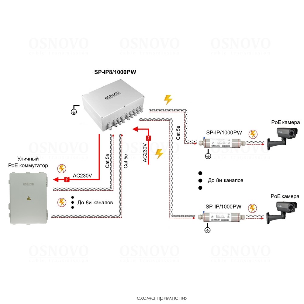 Уличное устройство грозозащиты на 8 портов для локальной вычислительной сети (скорость до 1000 Мб/с) с защитой линий PoE (af/at, методы A + B, контакты 1/2, 3/6, 4/5, 7/8) и защитой линии питания 220V. Двухступенчатая защита. Максимальное длительное рабочее напряжение (Uс) : PoE - DC58V, сетевого питания - 320V. Номинальный ток разряда (8/20 мкс, In) для линии PoE - 2,5kA, для линии 220V - 5kA. Суммарный ток разряда (8/20 мкс, Itotal) 10kA. Время отклика для защиты PoE - 1нс, для защиты линии 220V - 25нс(L-N)/100нс(N-PE). 8 входов (RJ45-мама), 8 выходов (RJ45-мама), 1 вход для линии 220V - клеммы под винт (3pin), 1 выход - клеммы под винт (3pin). Корпус из поликарбоната с классом защиты IP65. Размеры (ШхВхГ): 300x230x111мм. Рабочая температура: -40…+80°С.