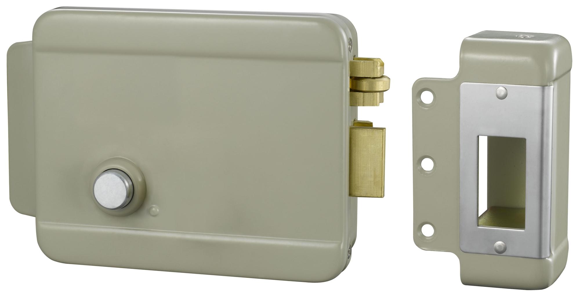 Эл-мех. накладной замок, НЗ, универсальный DIN, цилинр снаружи, кнопка изнутри, питание 12VDC/1А, -40°+50°С, окрашенная сталь.
