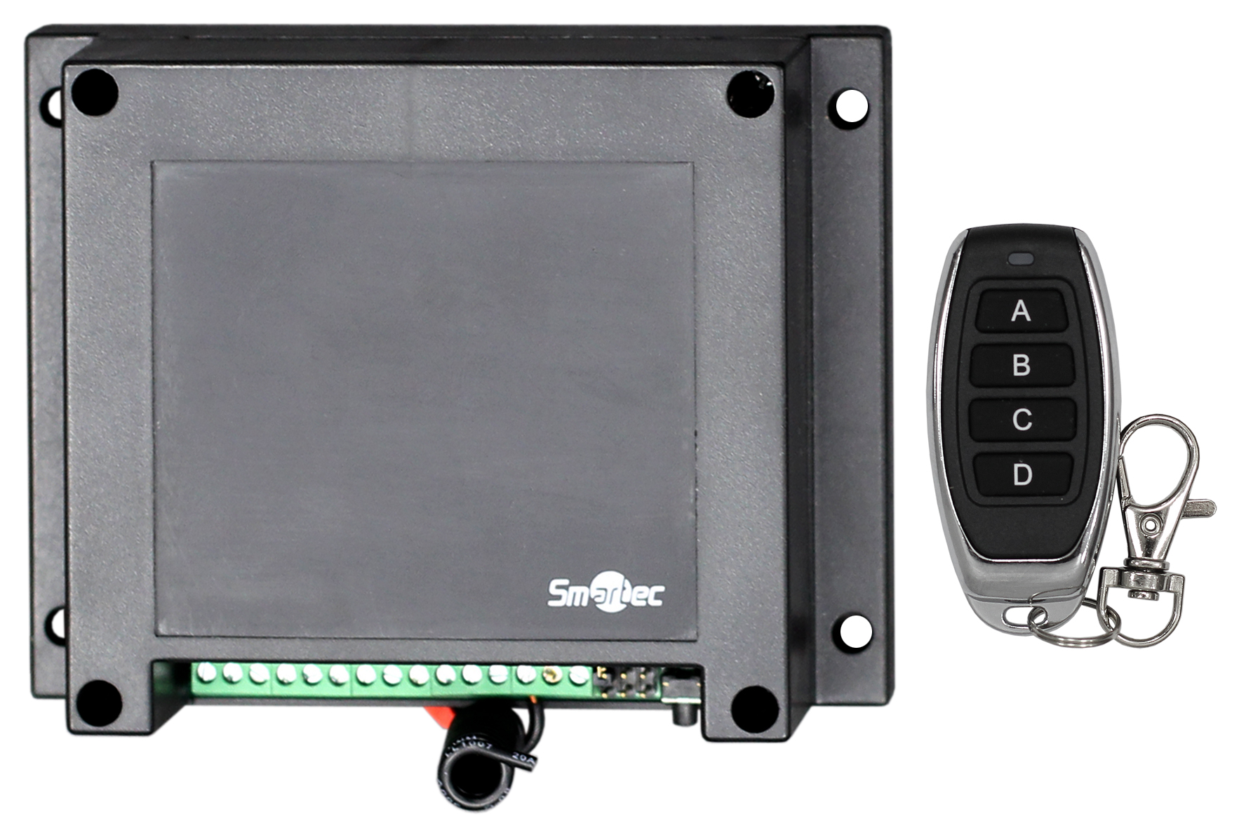 Комплект управления по радиоканалу с динамическим кодом (приемник + брелок), память до 10 брелоков, 4 реле НЗ/НР, триггерный, следящий и импульсный режимы, частота 433 МГц, 12 В DC / 24 В DC, 125 мА / 70 мА