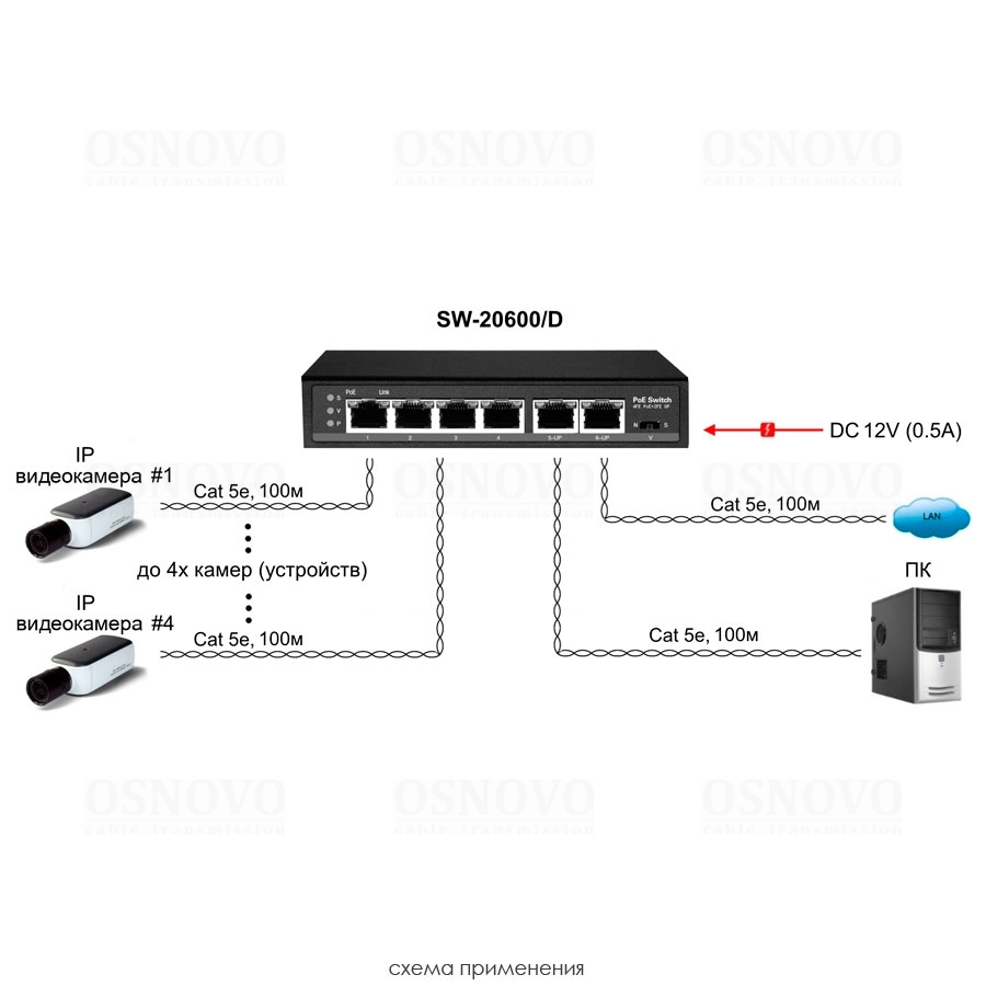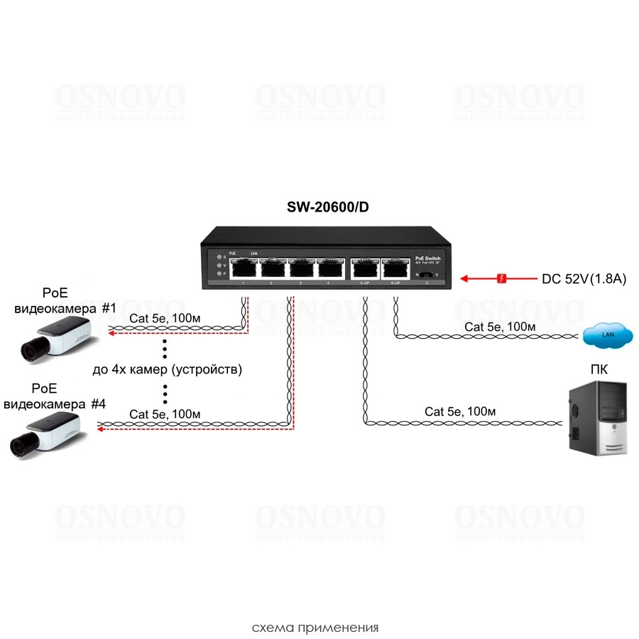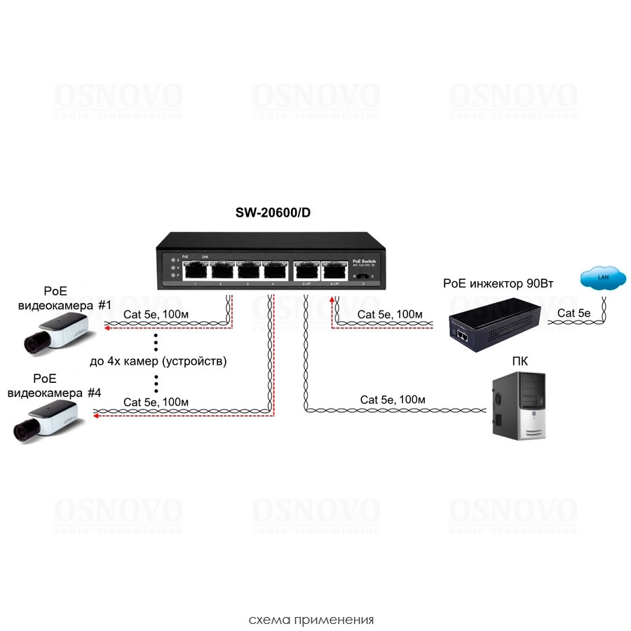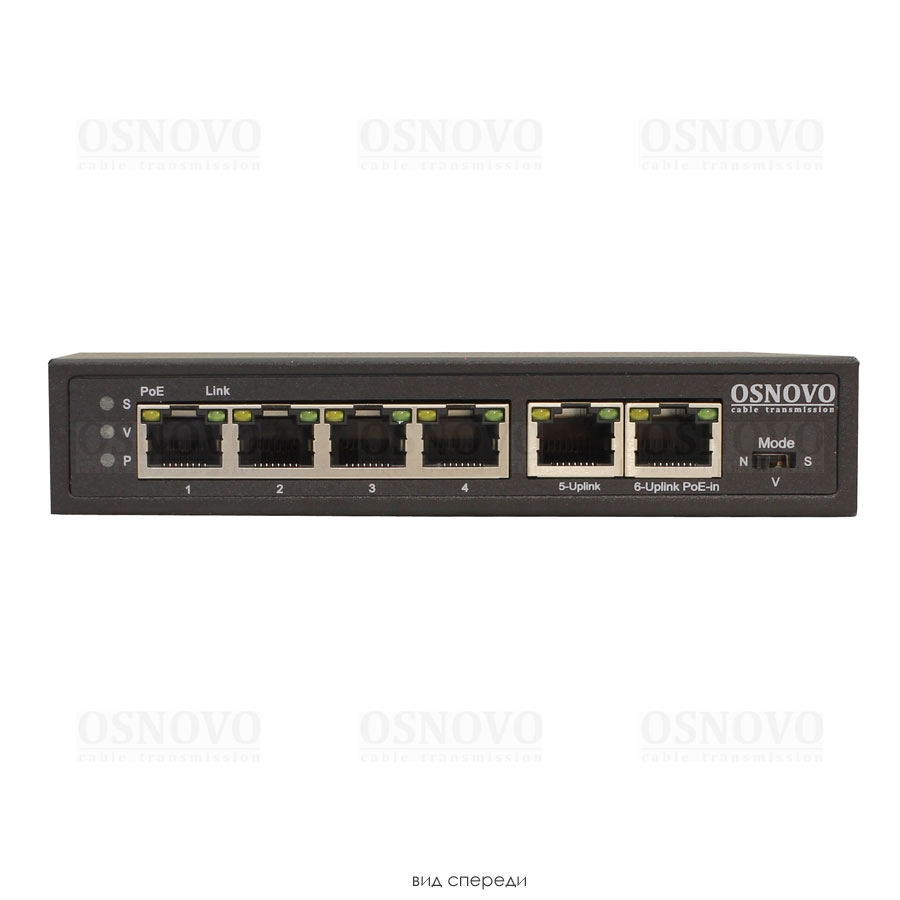 PoE Коммутатор/ удлинитель Fast Ethernet на 6 портов с питанием по PoE. Порты: 4 х FE (10/100 Base-T) с поддержкой PoE, 1 x FE (10/100 Base-T) Uplink с поддержкой питания по PoE (до 90W), 1 x FE (10/100 Base-T) Uplink. Соответствует стандартам PoE IEEE 802.3af/at. Автоматическое определение PoE устройств. Мощность PoE на порт - до 30W. Суммарная мощность PoE - до 87W. Поддержка режима CCTV: Увеличение расстояния передачи данных до 250м, изоляция портов. Встроенная грозозащита - 3kV. Возможно крепление на стену. Питание: По порту FE (10/100 Base-T) Uplink. Размеры (ШхВхГ): 140 x 28 x 80 мм. Рабочая температура: -10...+55 гр. С
