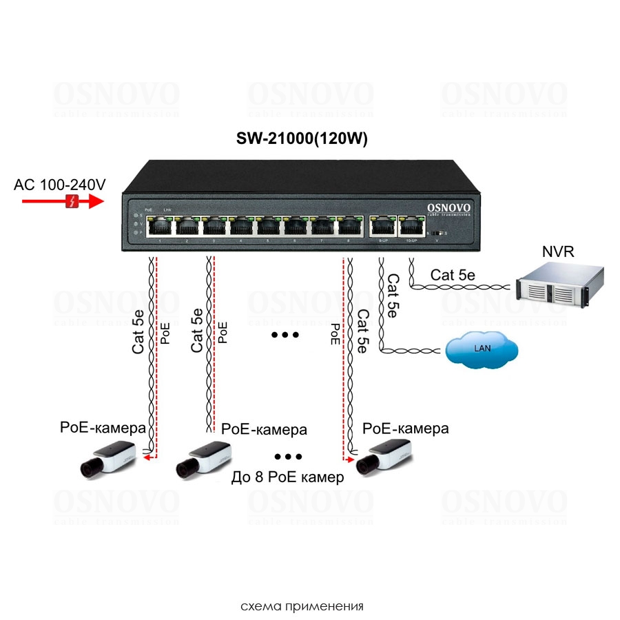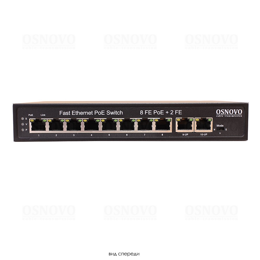 PoE коммутатор Fast Ethernet на 10 RJ45 портов. Порты: 1 x FE (10/100Base-T) с PoE (до 60W, A+B) + 7 x FE (10/100Base-T) с PoE (до 30W), 2 x FE (10/100 Base-T). Соответствует стандартам PoE IEEE 802.3af/at/bt. Автоматическое определение и режим антизависания PoE устройств. Суммарная мощность PoE - до 120W. Поддержка режима CCTV: Увеличение расстояния передачи данных и питания до 250м, изоляция портов (VLAN). Встроенная грозозащита 6кВ. Питание: встроенный БП AC100-240V (123W). Размеры (ШxВxГ): 210x35x150мм. Рабочая температура: -10...+55 гр. С.