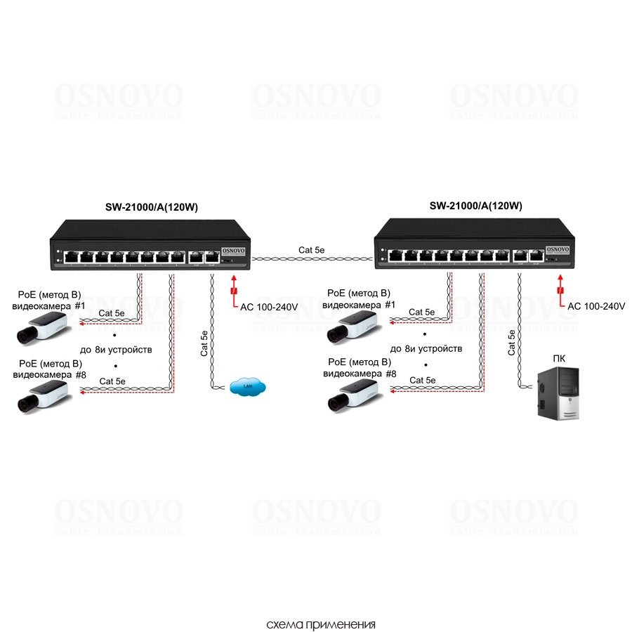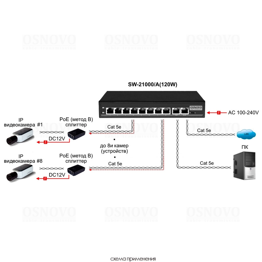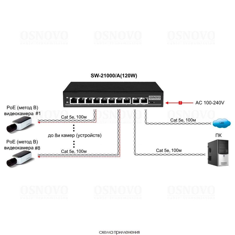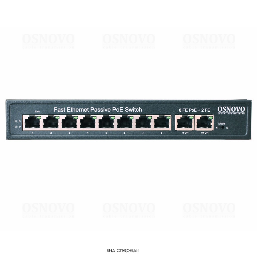 Passive PoE коммутатор Fast Ethernet на 10 портов. Порты: 8 х FE (10/100 Base-T, 52V 4,5(+) 7,8(–)) совместимы с PoE (IEEE 802.3af/at), 2 x FE (10/100 Base-T) Uplink. Совместим со стандартами PoE IEEE 802.3af/at. Мощность PoE на порт - до 30W. Выходное напряжение 52V. Поддержка режима CCTV: Увеличение расстояния передачи данных и питания до 250м. Встроенная грозозащита 3кВ. Питание: AC100-240V. Встроенный БП. Размеры (ШхВхГ): 210x35x150мм. Рабочая температура: 0...+50 гр. С)
