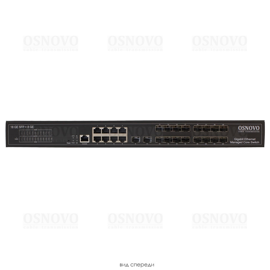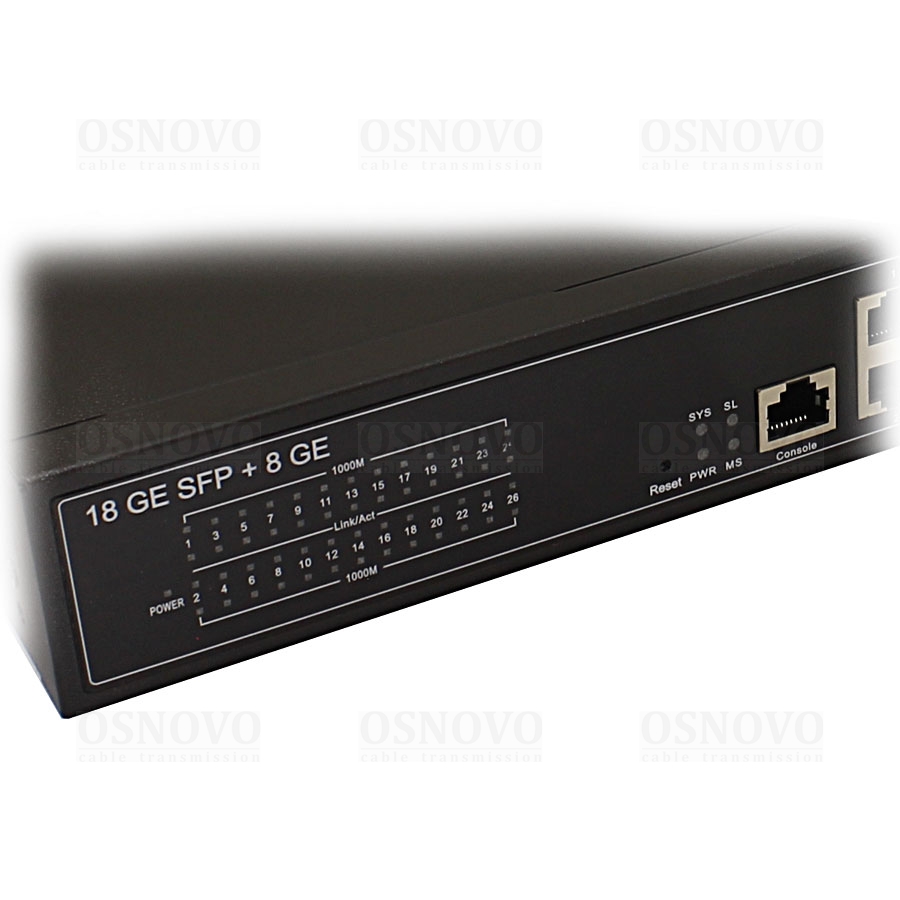 Управляемый L2+ коммутатор Gigabit Ethernet на 18 x GE SFP + 8 x GE RJ45 портов. Порты: 18 x GE SFP (1000 Base-X), 8 x GE (10/100/1000 Base-T). Консольный порт, Уровень управления L2 (Full managed), Поддержка Jumbo Frame 16K, IGMP Snooping, Поддержка режима CCTV: Увеличение расстояния передачи данных и питания до 250м.Монтаж в 19" стойку, крепление в комплекте. Питание: AC100-240V(35W) Встроенный БП - 2шт. Резервирование питания. Размеры (ШхВхГ): 440 x 45 x 210мм. Рабочая температура: 0...+50 гр. С.