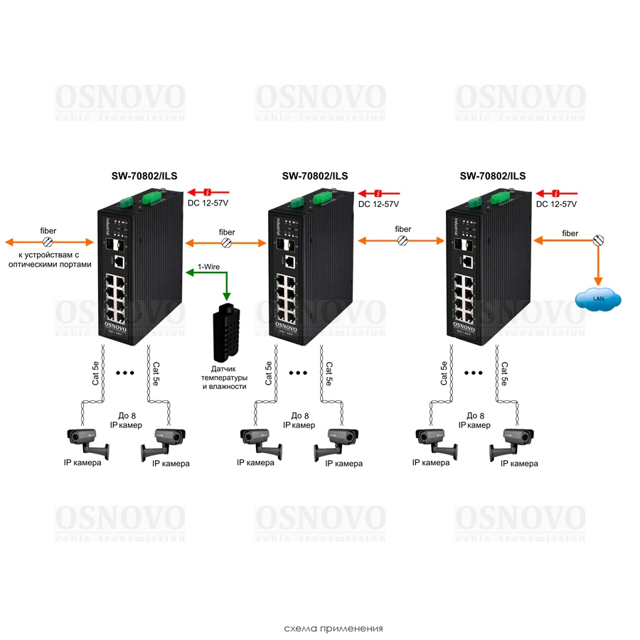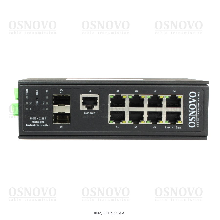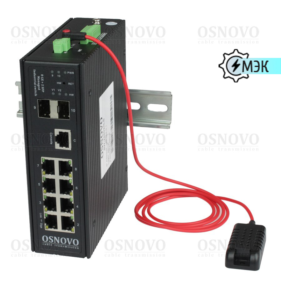 Промышленный управляемый (L2+) коммутатор Gigabit Ethernet на 8GE RJ45 + 2 GE SFP порта с функцией мониторинга температуры/ влажности/ напряжения. Порты: 8 x GE (10/100/1000Base-T) + 2 x GE SFP (1000Base-X). Уровень управления L2+. Встроенная система мониторинга температуры/ напряжения + внешний датчик температуры/ влажности. Поддержка ПО OSNOVO Monitoring System. Выходы типа "Сухой контакт", Цифровой вход. Поддержка режима увеличения расстояния передачи данных до 250м. Встроенная грозозащита 6кВ. Питание: 2 x входа DC12-57V(15W). БП в комплект НЕ входит. Монтаж на DIN-рейку или на стену (крепление в комплекте). Размеры (ШхВхГ): 50х162х130мм. Вес: 1,1кг. Рабочая температура: -40…+80°С.