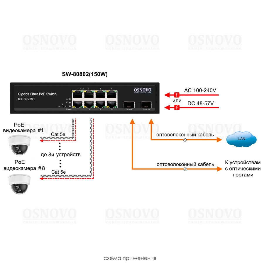 PoE коммутатор Gigabit Ethernet на 8 RJ45 + 2 SFP порта. Порты: 1 x GE (10/100/1000Base-T) с PoE (до 60W, A+B) + 7 x GE (10/100/1000Base-T) с PoE (до 30W), 2 x GE SFP (1000 Base-T). Соответствует стандартам PoE IEEE 802.3af/at/bt. Автоматическое определение и режим антизависания PoE устройств. Суммарная мощность PoE до 150W. Поддержка режима CCTV: Увеличение расстояния передачи данных и питания до 250м, изоляция портов (VLAN).Встроенная грозозащита 3 кВ. Питание: AC100-240V или БП DC48-57V(3,5A). Встроенный БП. Монтаж в 19 - дюймовую стойку, крепление в комплекте. Размеры (ШxВxГ): 210x35x150мм. Рабочая температура: -10...+55 гр.