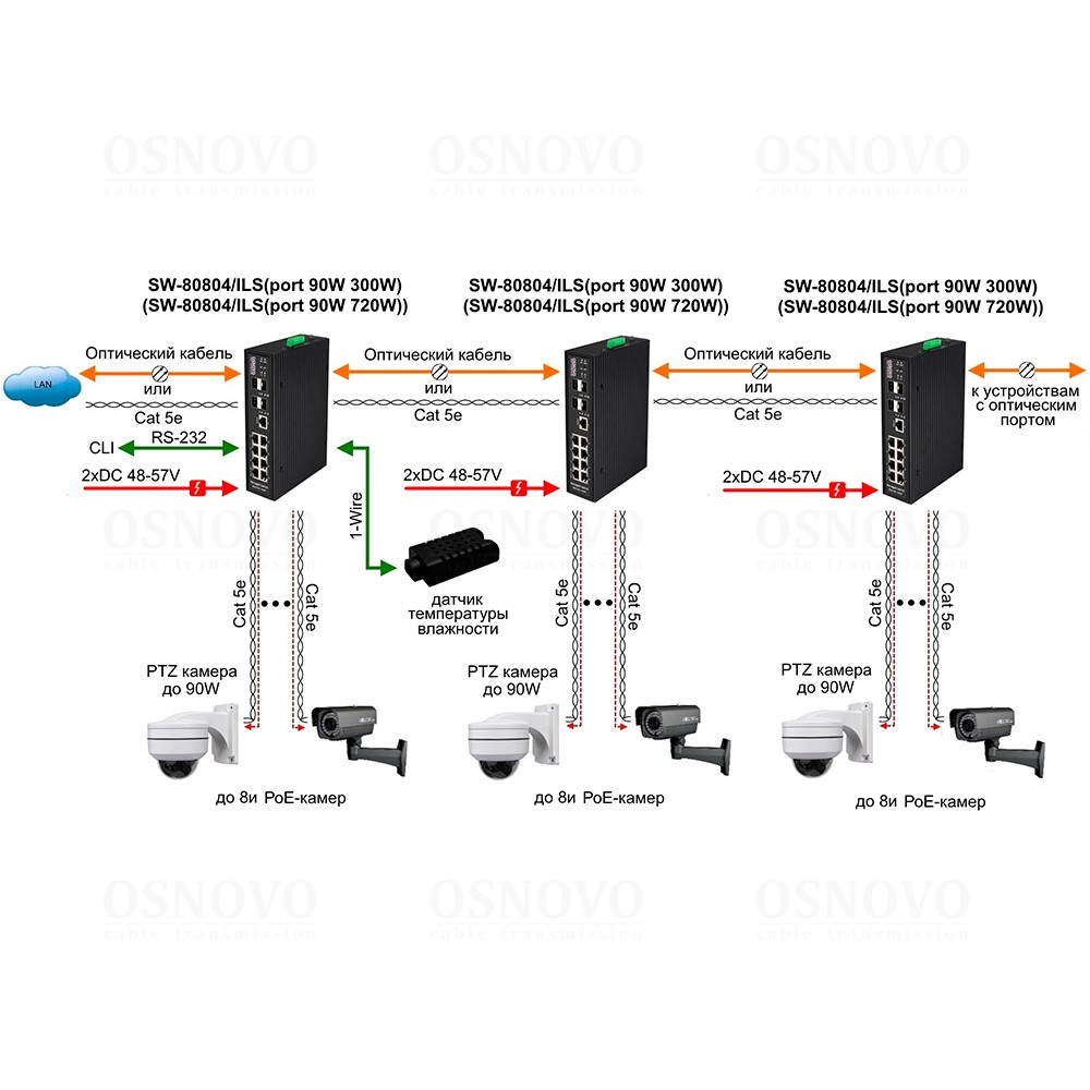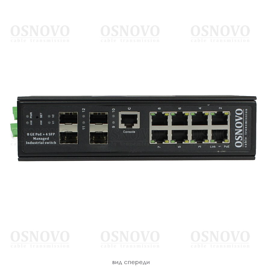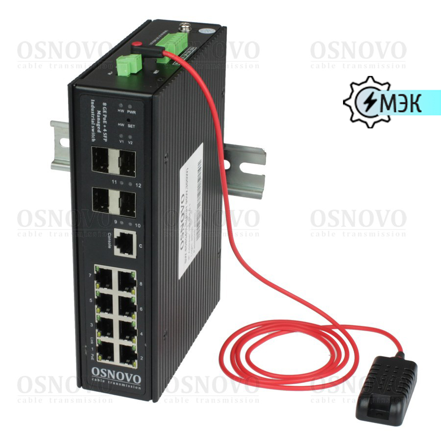Промышленный управляемый (L2+) HiPoE коммутатор Gigabit Ethernet на 8GE PoE + 4GE SFP порта. С функцией мониторинга температуры/влажности/напряжения. Порты: 1 x GE (10/100/1000Base-T) с PoE BT (до 90W) + 7xGE (10/100/1000Base-T) с PoE (до 30W) + 4xGE SFP (1000Base-X). Уровень управления L2+. Соответствует стандартам PoE IEEE 802.3af/at/bt. Автоматическое определение и режим антизависания PoE устройств. управление питанием. Суммарная мощность PoE до 300W. Поддержка режима CCTV: Увеличение расстояния передачи данных и питания до 250м. Встроенная система мониторинга температуры/напряжения + внешний датчик температуры/влажности. Поддержка ПО OSNOVO Monitoring System. Выходы типа "Сухой контакт", Цифровой вход. Встроенная грозозащита 6кВ. Питание: 2 x входа DC48-57V(315W). БП в комплект НЕ входит. Монтаж на DIN-рейку или на стену (крепление в комплекте). Размеры (ШхВхГ): 50х187х130мм. Вес: 1,3кг. Рабочая температура: -40…+80°С.