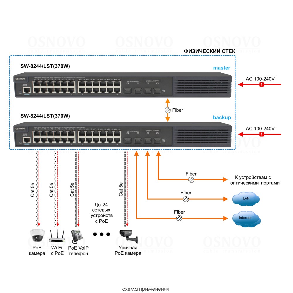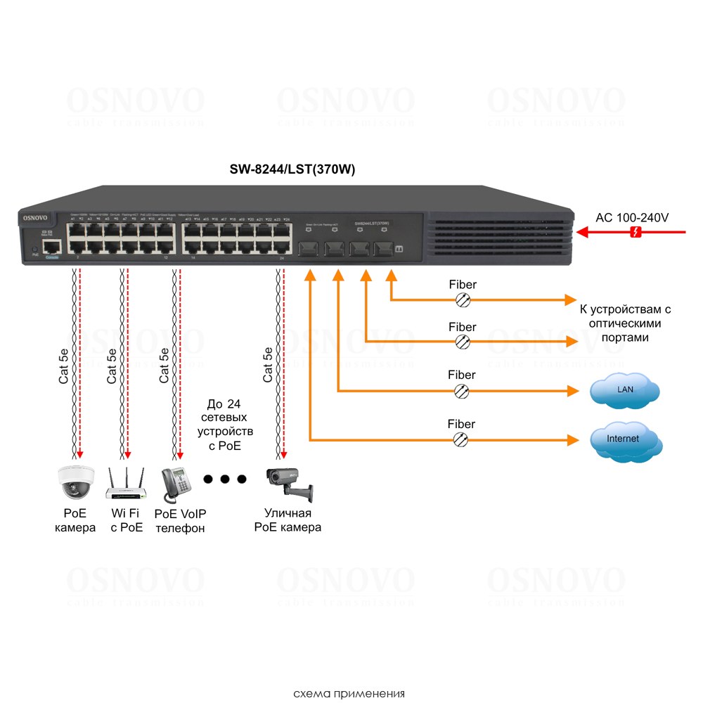Управляемый L2+ стекируемый PoE коммутатор Gigabit Ethernet на 24 RJ45 PoE + 4 x SFP uplink порта. Порты: 4 x GE (10/100/1000Base-T) с PoE (до 60W) + 20 x GE (10/100/1000Base-T) с PoE (до 30W), 4 x GE SFP. Соответствует стандартам PoE IEEE 802.3af/at/bt. Автоматическое определение PoE устройств. Суммарная мощность PoE до 370W. Встроенная грозозащита коммуникационных портов 6kV на порт. Питание: AC90-253V (460W). Встроенный БП. Монтаж в 19 - дюймовую стойку, крепление в комплекте. Размеры (ШхВхГ): 440 x 44 x 260мм. Рабочая температура: 0…+50°С.