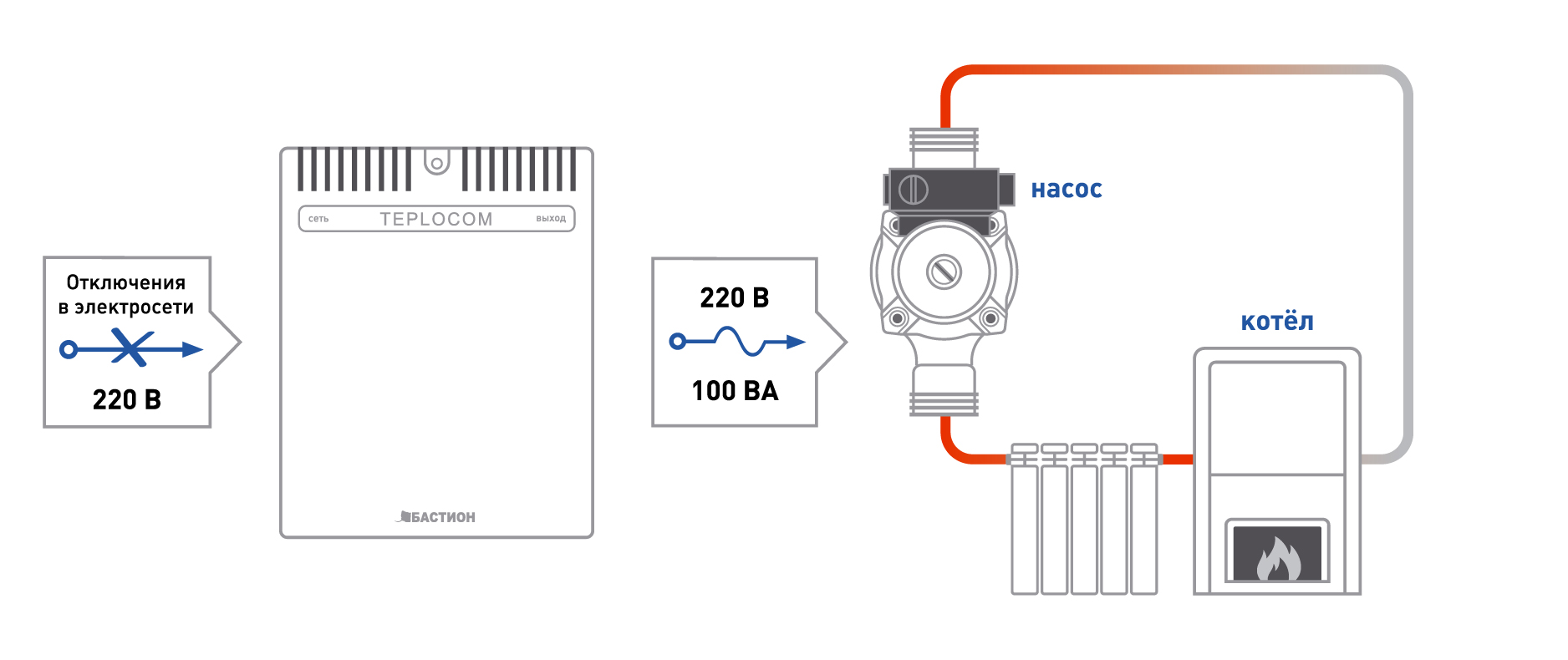 TEPLOCOM-100+ предназначен для бесперебойного электропитания оборудования систем теплоснабжения (циркуляционных насосов, электроклапанов, электроприводов) и другого оборудования мощностью до 100 ВА. Форма выходного напряжения – чистый синус, что обеспечивает корректную и долговременную работу насосов и других электроприводов. ИБП идеально подходит для обеспечения бесперебойным питанием внешних циркуляционных насосов в составе системы отопления, реализованной на базе энергонезависимых или твердотопливных котлов. Автоматический переход на резервное питание от АКБ при пропадании сети.