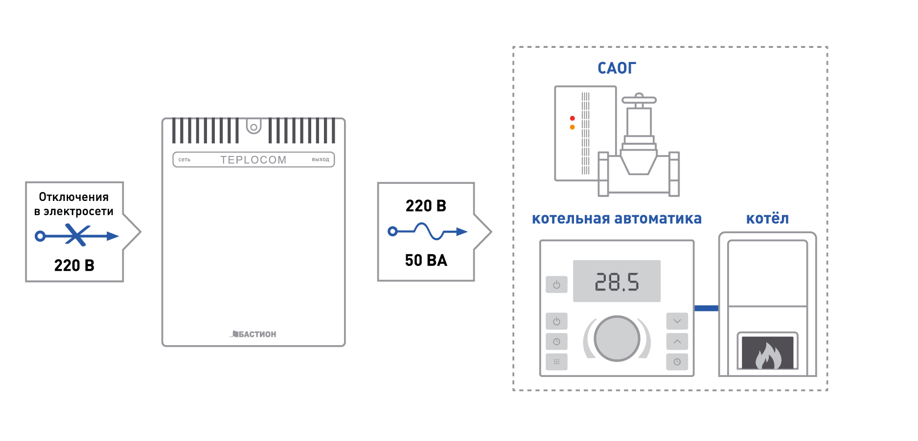 TEPLOCOM-50+ предназначен для бесперебойного электропитания котельной автоматики, систем типа САОГ (системы аварийного отключения газа) и другого оборудования 220 В мощностью до 50 ВА. Применение схемотехники Online с двойным преобразованием энергии обеспечивает подключенное оборудование качественным стабильным питанием. В случае отключения электроэнергии источник питания мгновенно переходит на работу от аккумуляторной батареи, защищая котельную автоматику от зависания, а системы САОГ от ложных срабатываний.