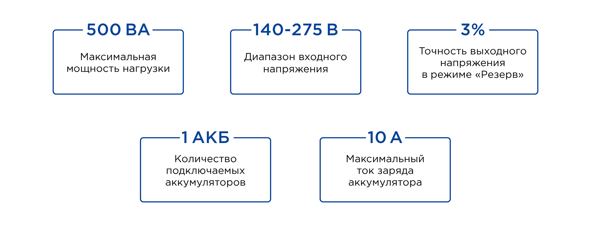 - качественное, бесперебойное, эффективное и надёжное электропитание нагрузок с номинальным напряжением питания 220 В переменного тока и потребляемой мощностью до 500 ВА;