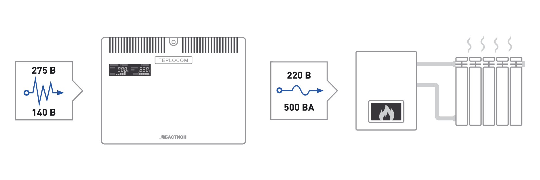 Новые источники бесперебойного питания TEPLOCOM при наличии сети стабилизируют напряжение и защищают оборудование, а при отсутствии сети обеспечивают резервную работу отопительного оборудования.
