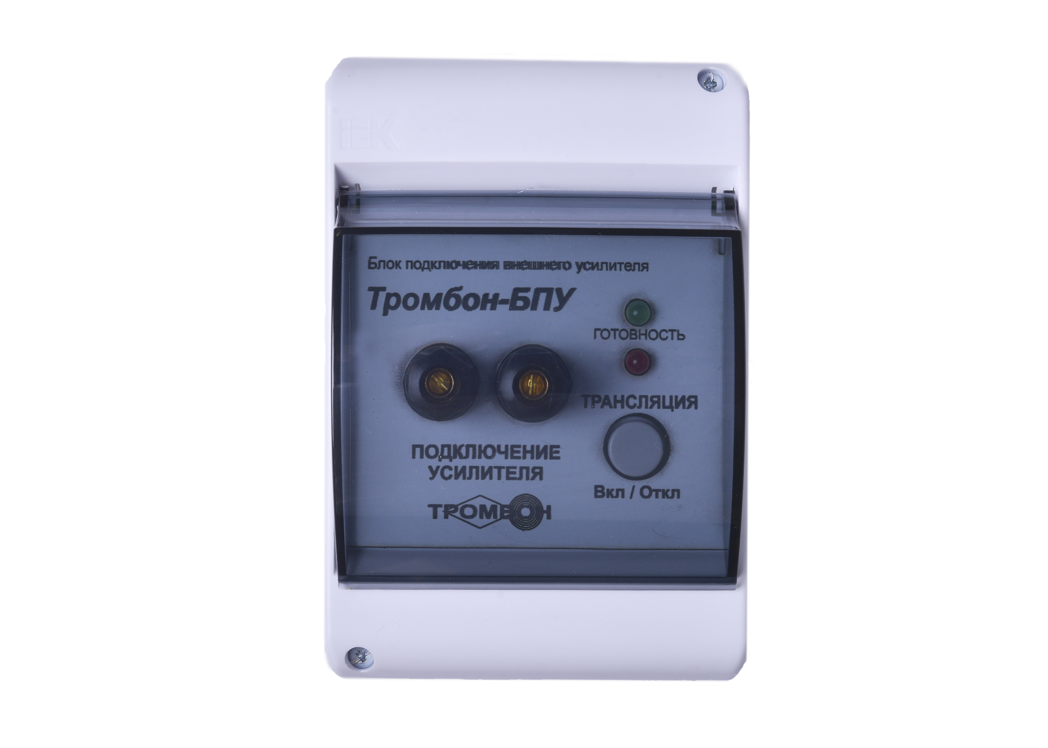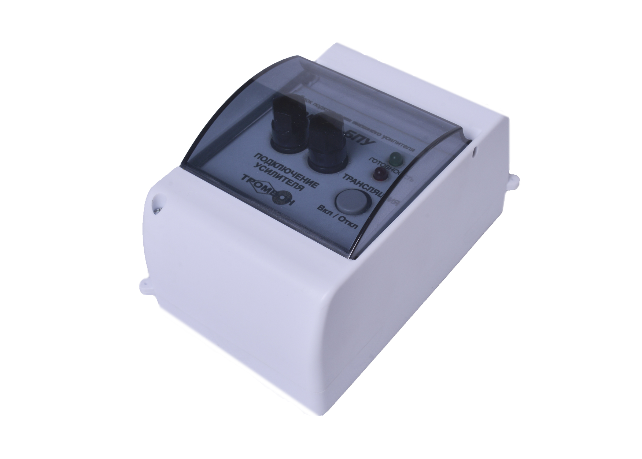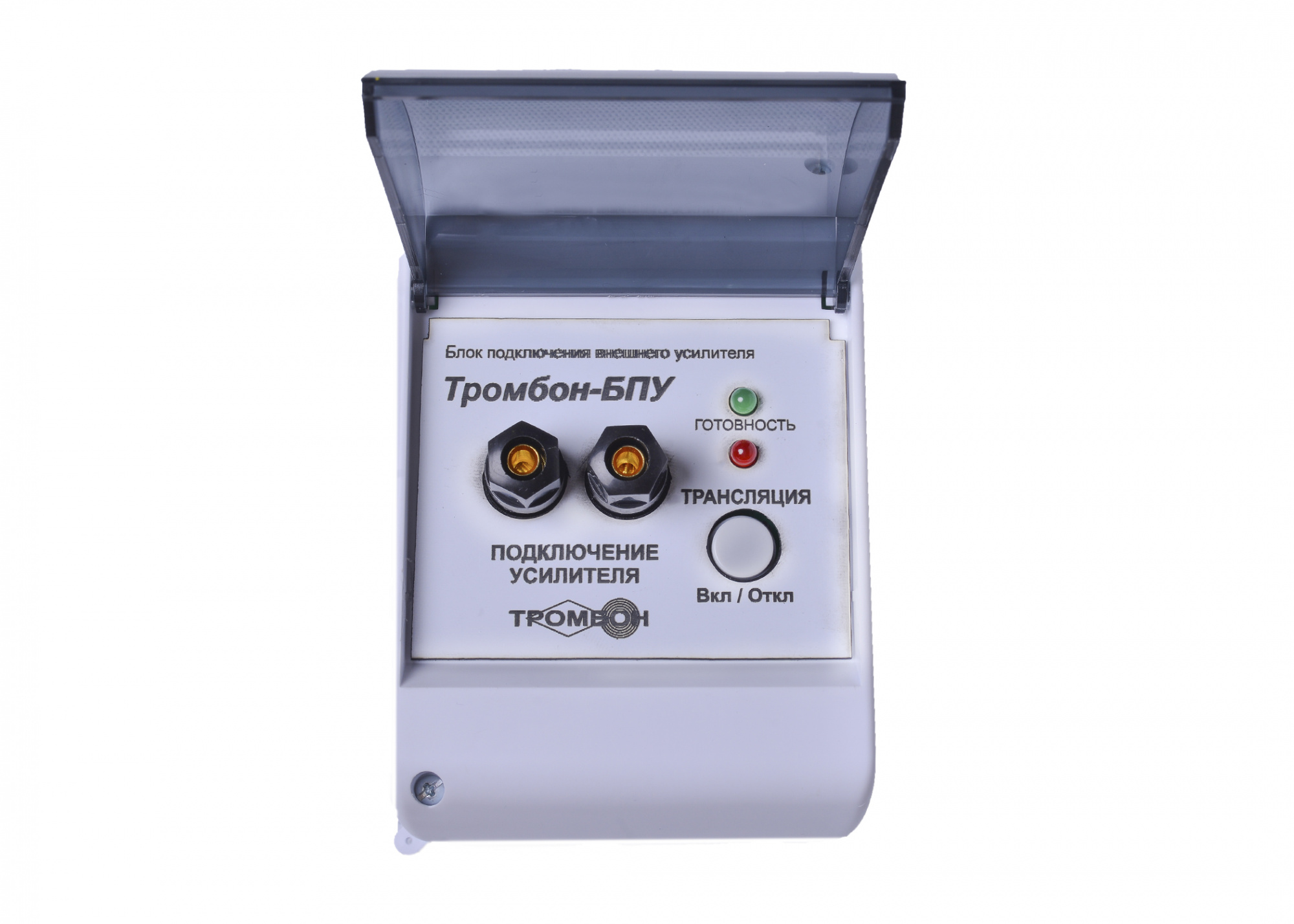 Блок подключения усилителя предназначен для подключения к линии оповещения местного трансляционного усилителя мощности (например, для локального озвучивания школьного актового зала). Блок также обеcпечивает управление коммутаторами линий «Тромбон КЛ-Н» и «Тромбон КЛ-Р».