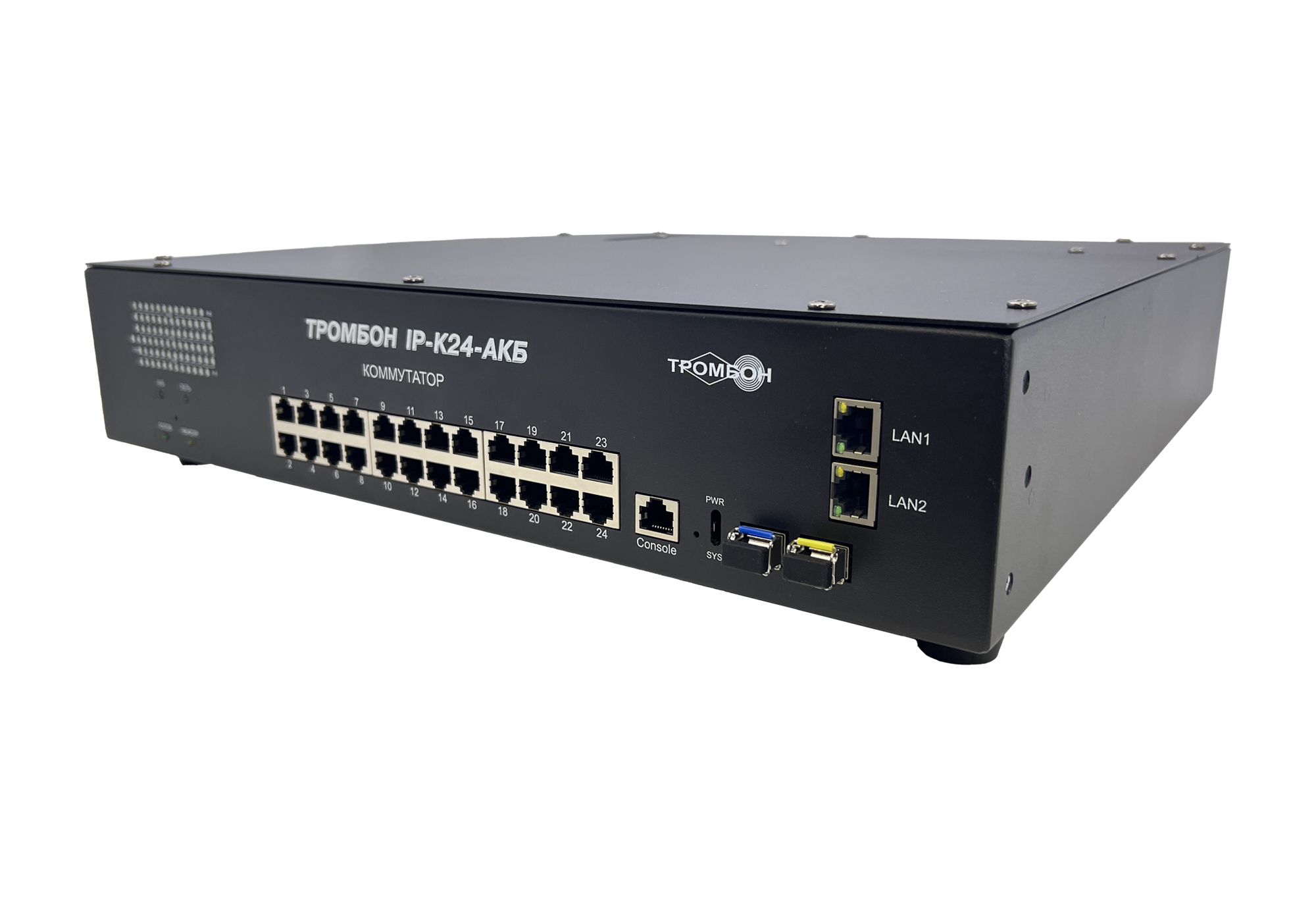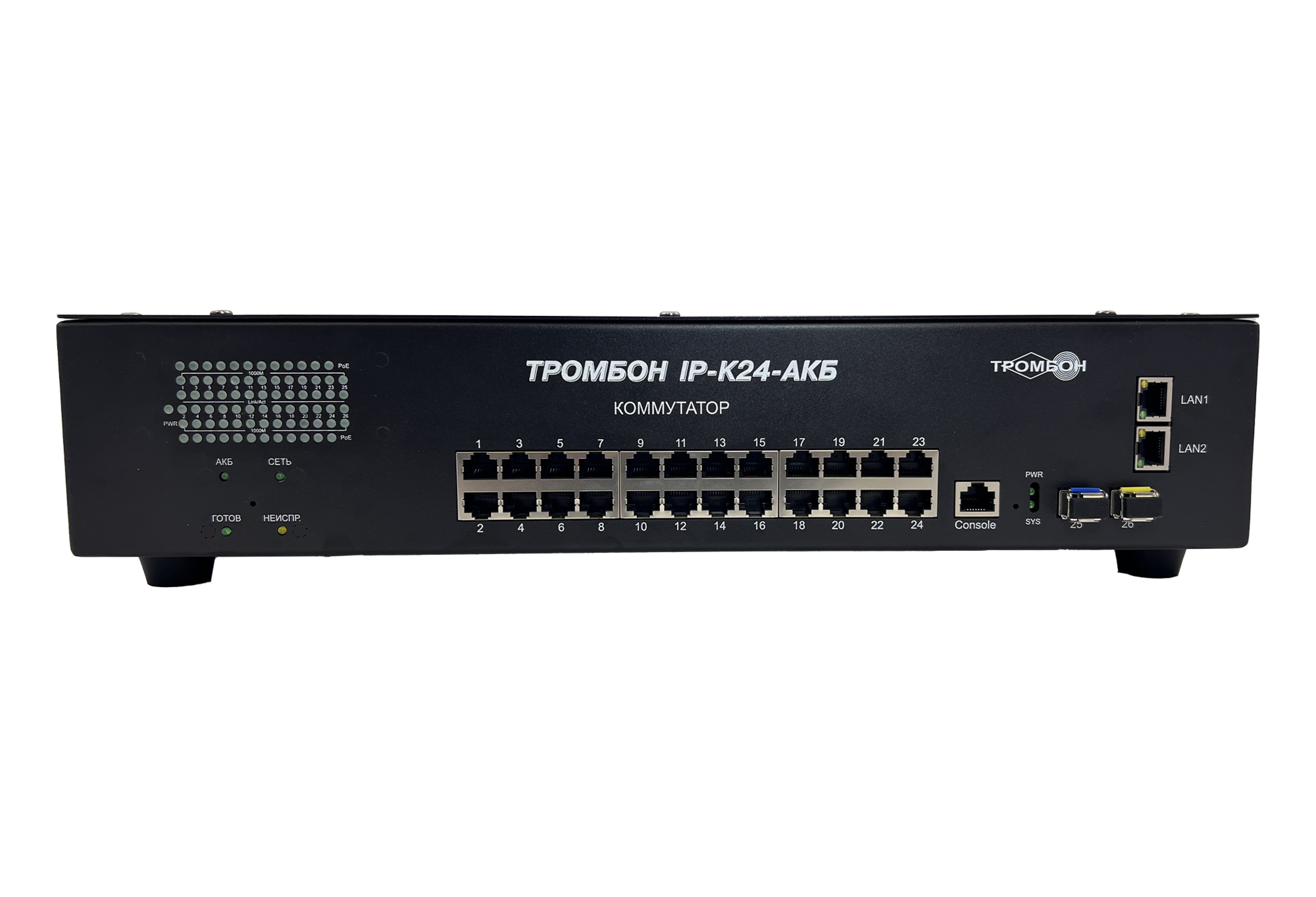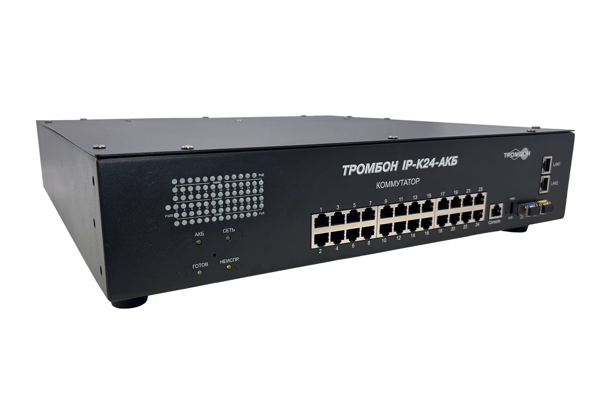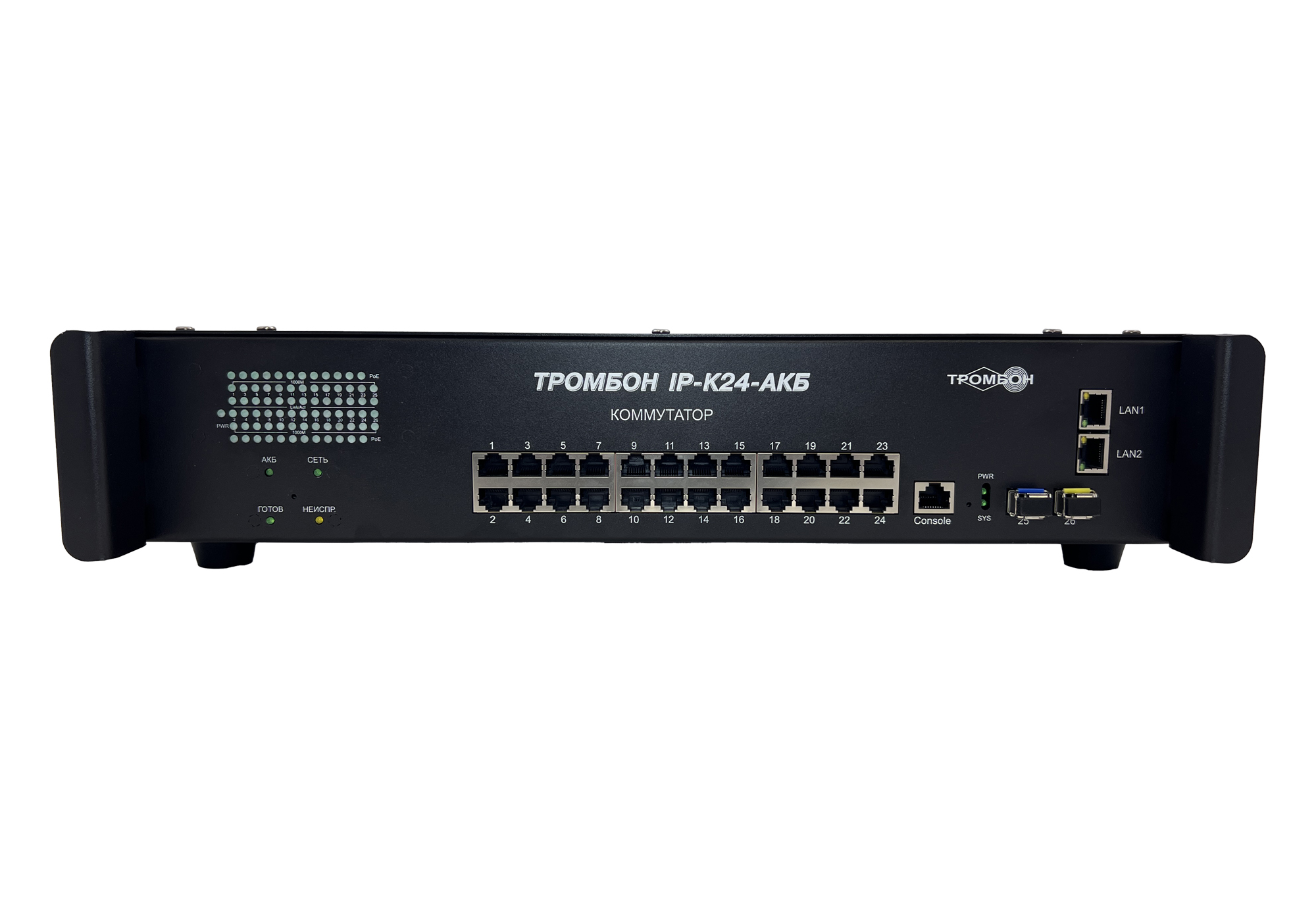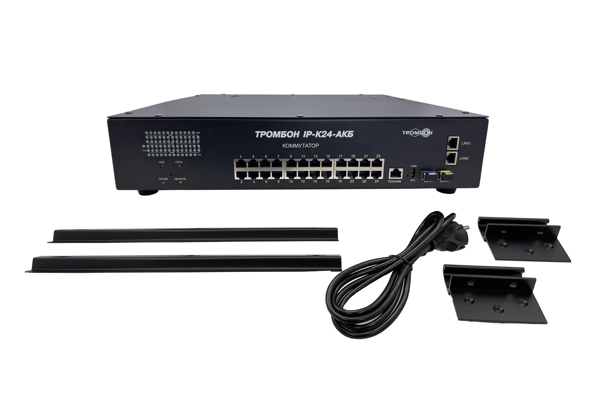 Сетевой коммутатор «Тромбон IP-K24-АКБ» предназначен для соединения нескольких узлов компьютерной сети в пределах одного или нескольких сегментов сети. Служит для приема и передачи данных между функциональными блоками. Поддержка технологии РоЕ позволяет передавать питание на различные удалённые устройства и периферию. Коммутатор используется в системе «Тромбон IP» в качестве сетевого PoE коммутатора, для связи функциональных блоков системы и обеспечения питанием устройств, требующих питания PoE.