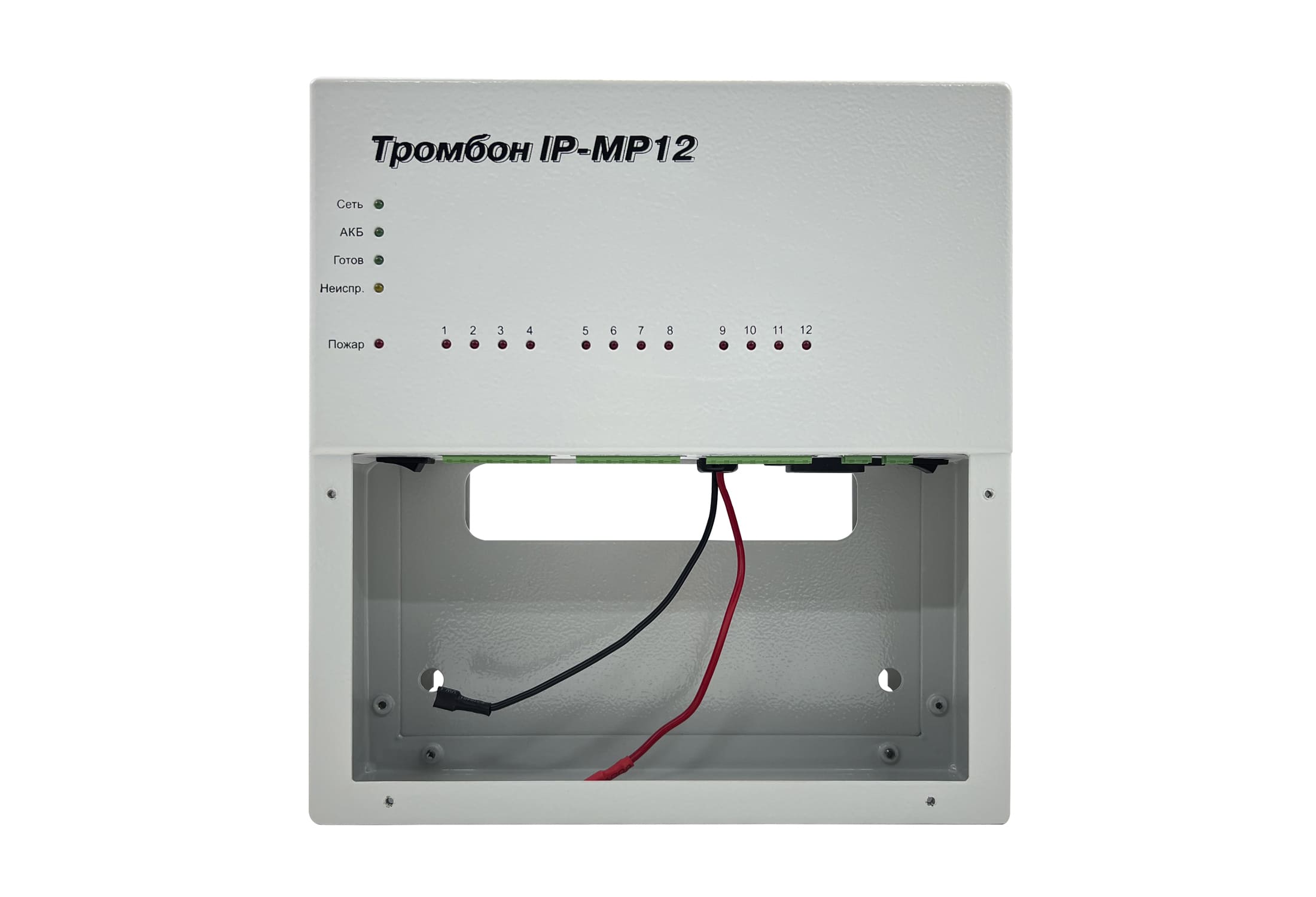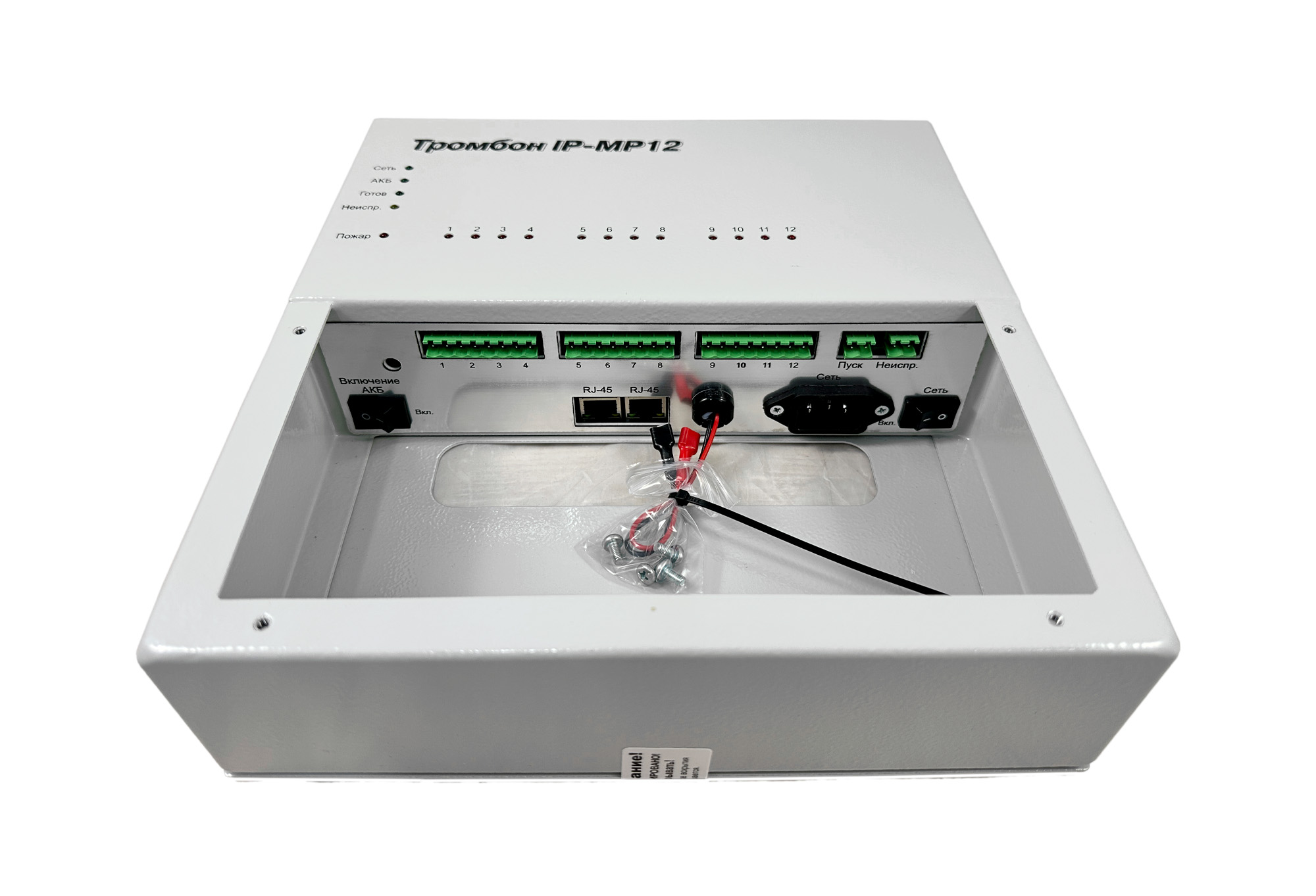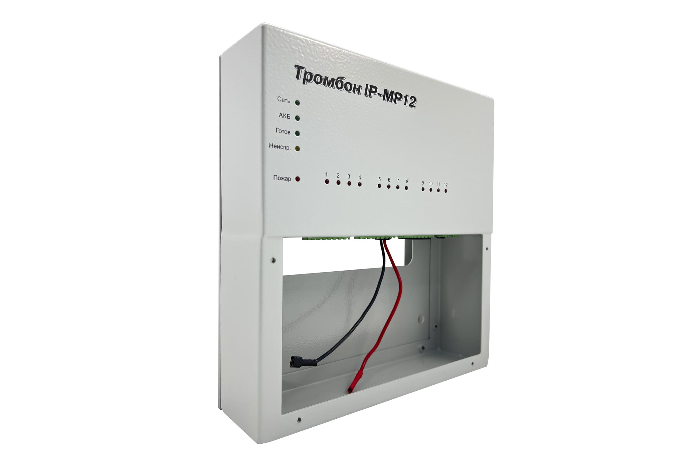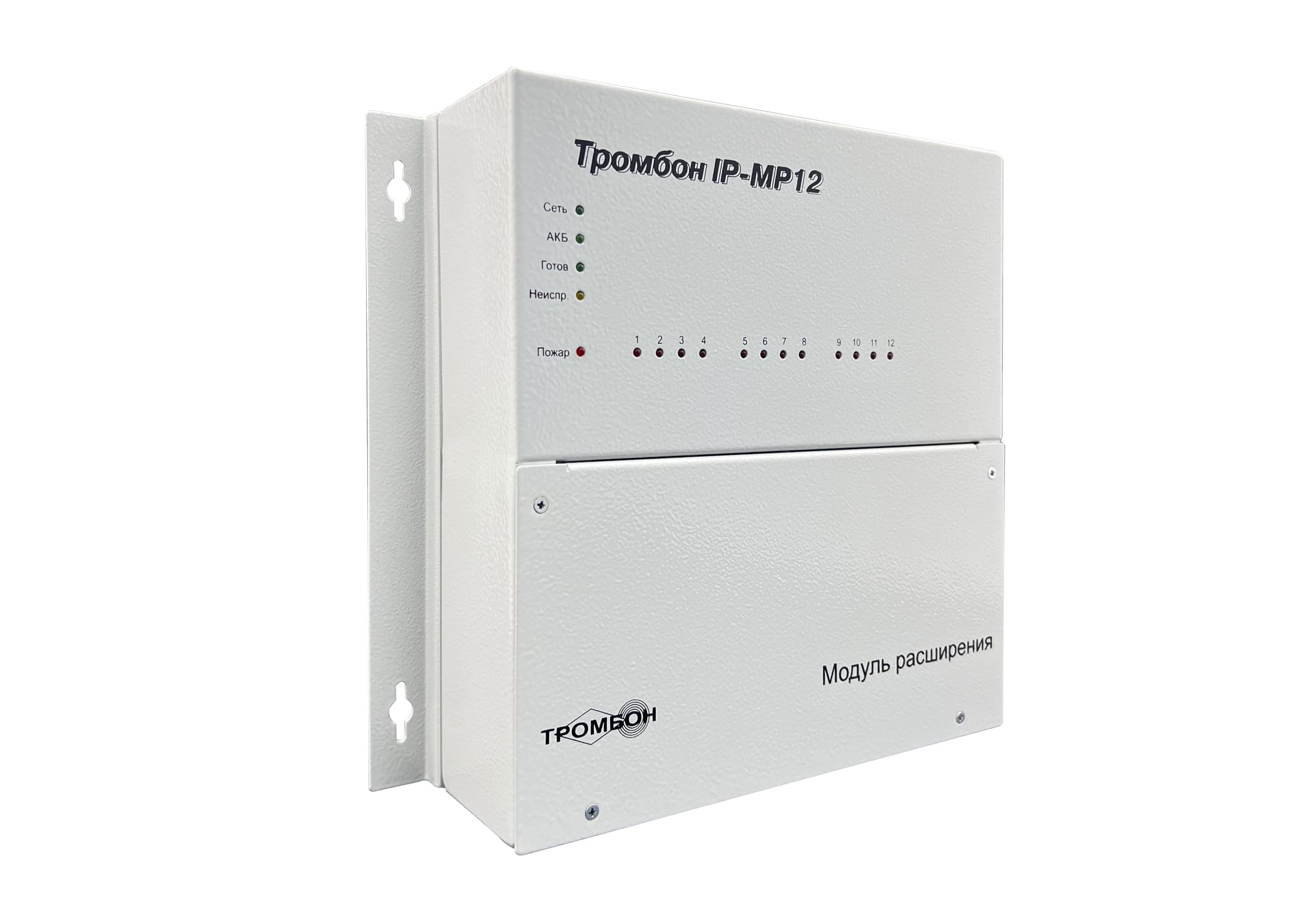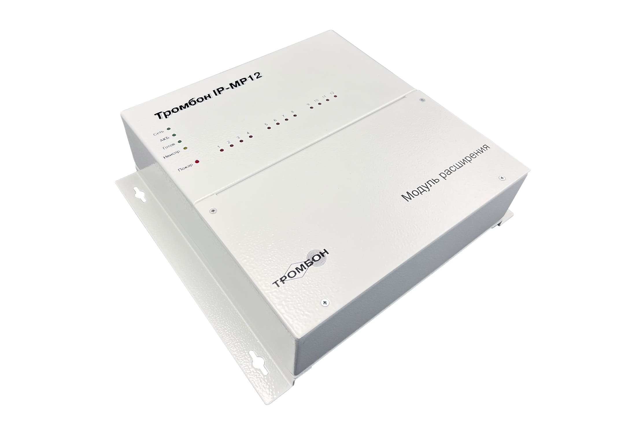 Модуль расширения «Тромбон IP-МР12» предназначен для работы в составе системы звукового вещания, оповещения и управления эвакуацией «Тромбон IP» только совместно с «Тромбон IP-МО8». Модуль служит для приёма тревожных сигналов от систем ППКП и передаче их на модуль оповещения «Тромбон IP-МО8» посредством локальной вычислительной сети.