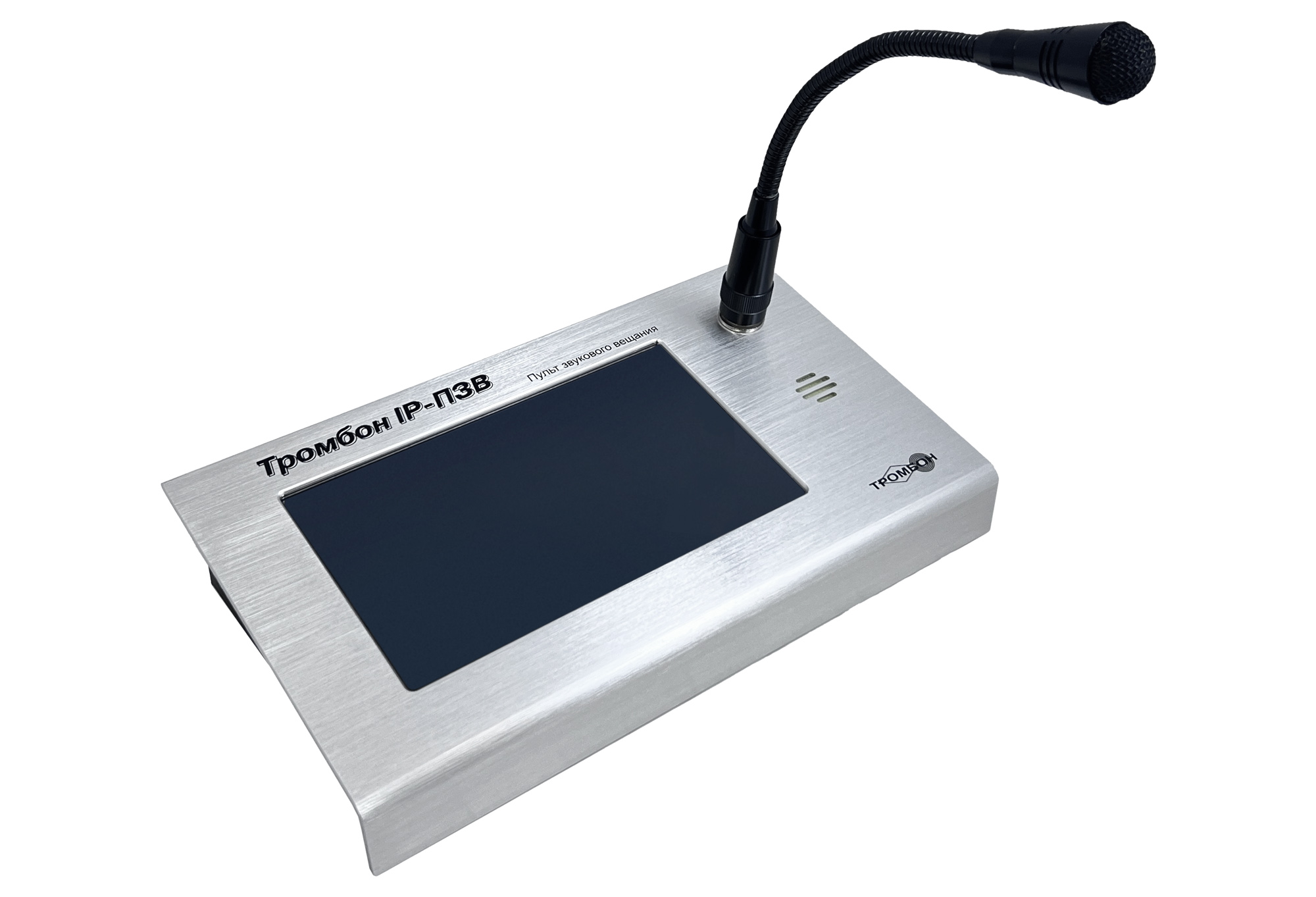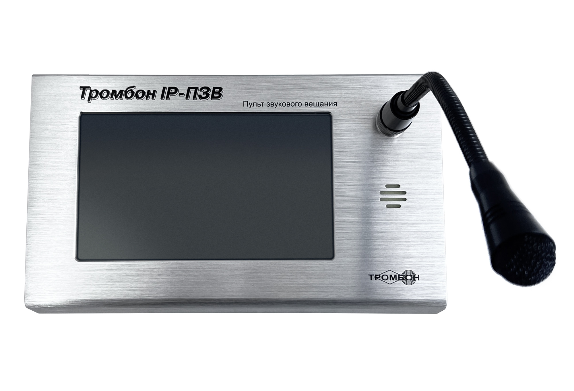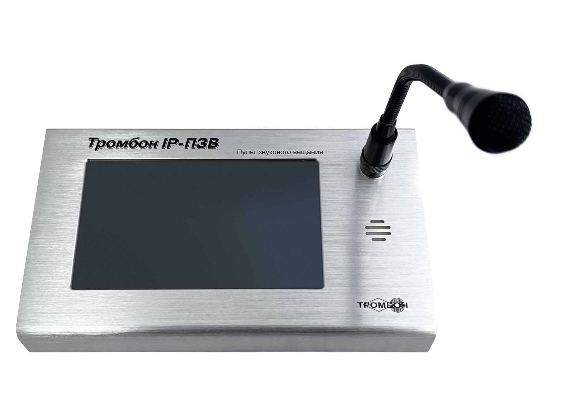 Настольный пульт звукового вещания «Тромбон IP-ПЗВ» предназначен для управления системой музыкальной трансляции (системой оповещения) Тромбон IP, а также передачи музыкального контента во всех популярных форматах в различные зоны вещания, голосовых сообщений посредствам микрофона в зону или группу зон. Возможна двухсторонняя связь «точка-точка» с другими «Тромбон IP-ПЗВ» и настенными вызывными панелями «Тромбон IP-ВП». Система может содержать до 255 независимых пультов звукового вещания.