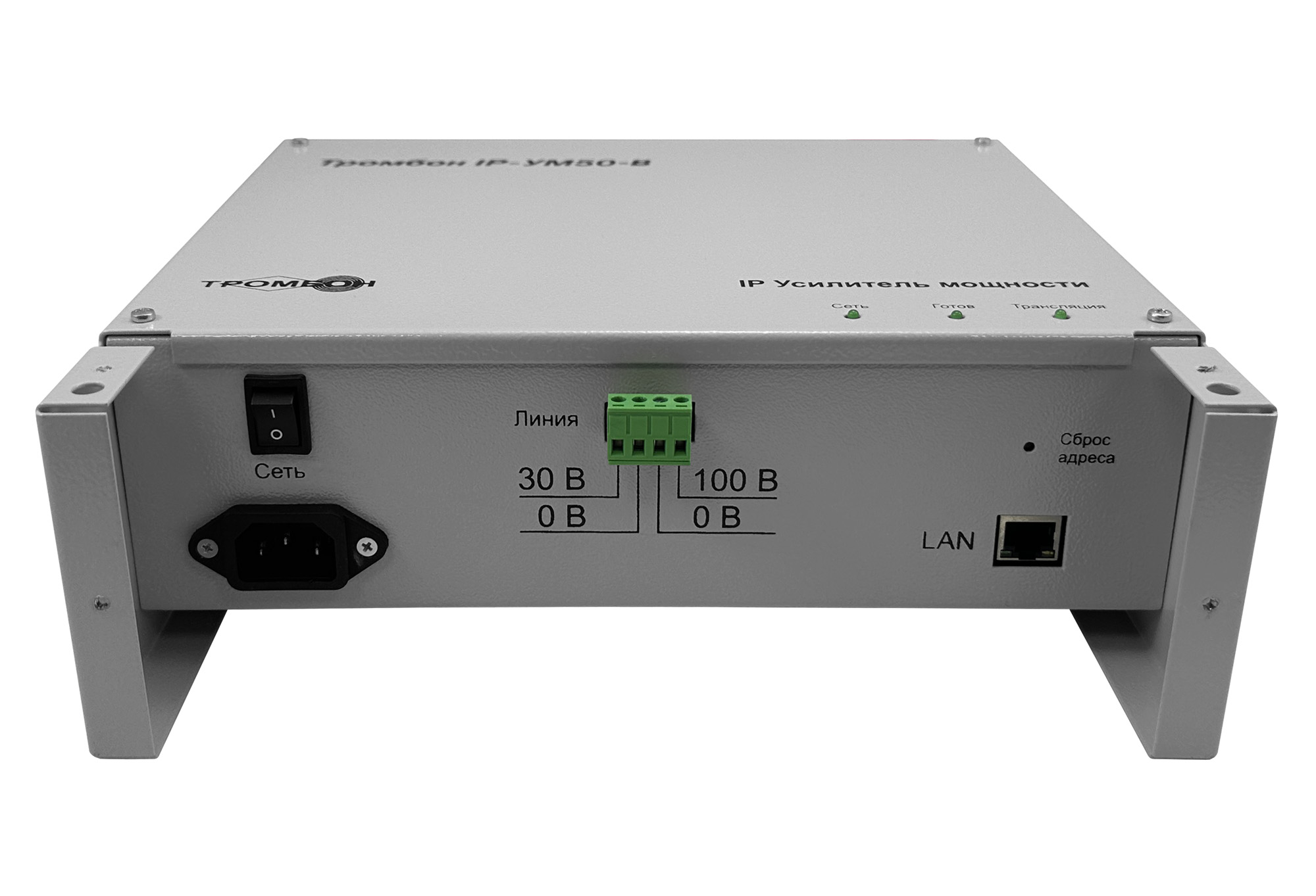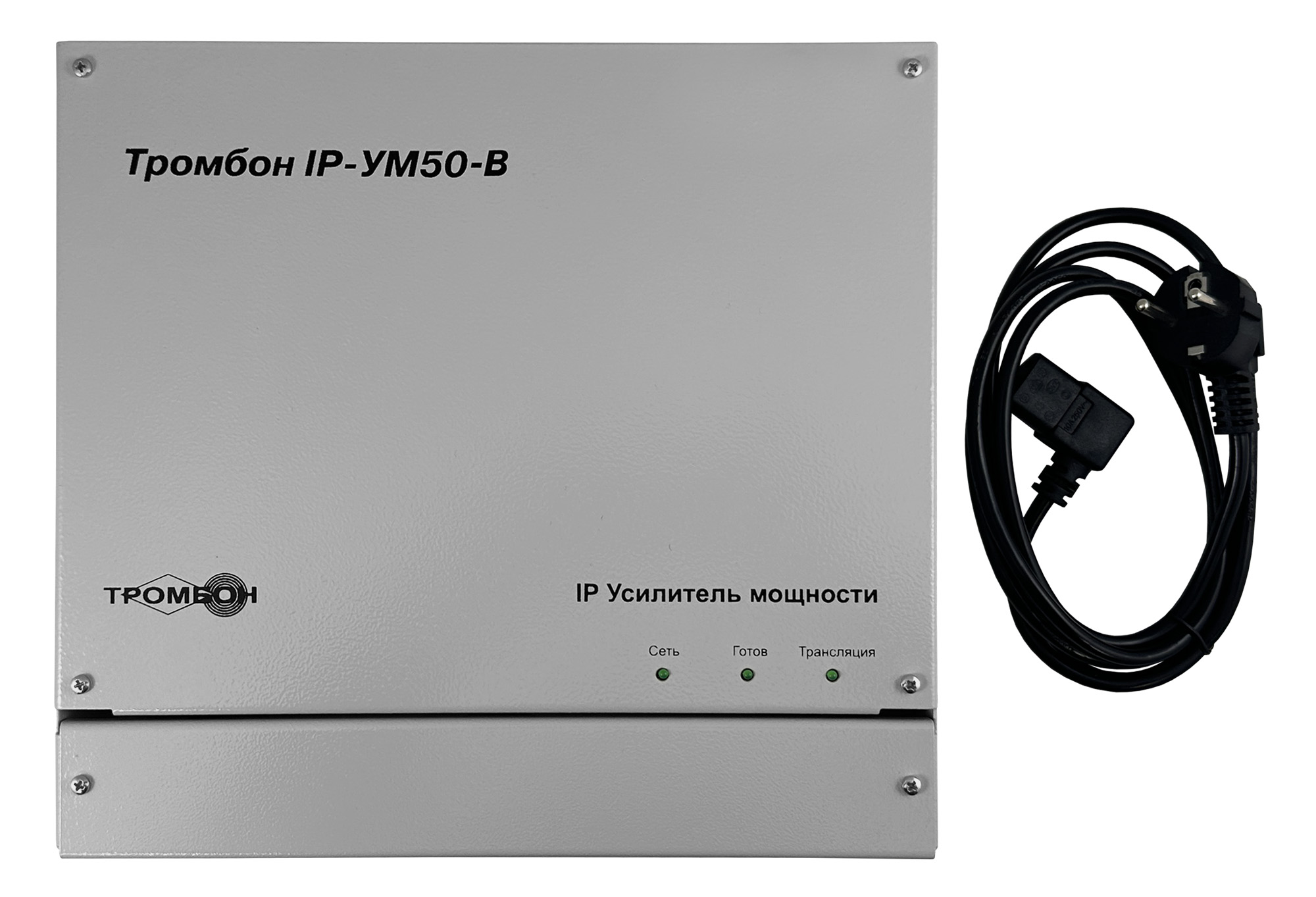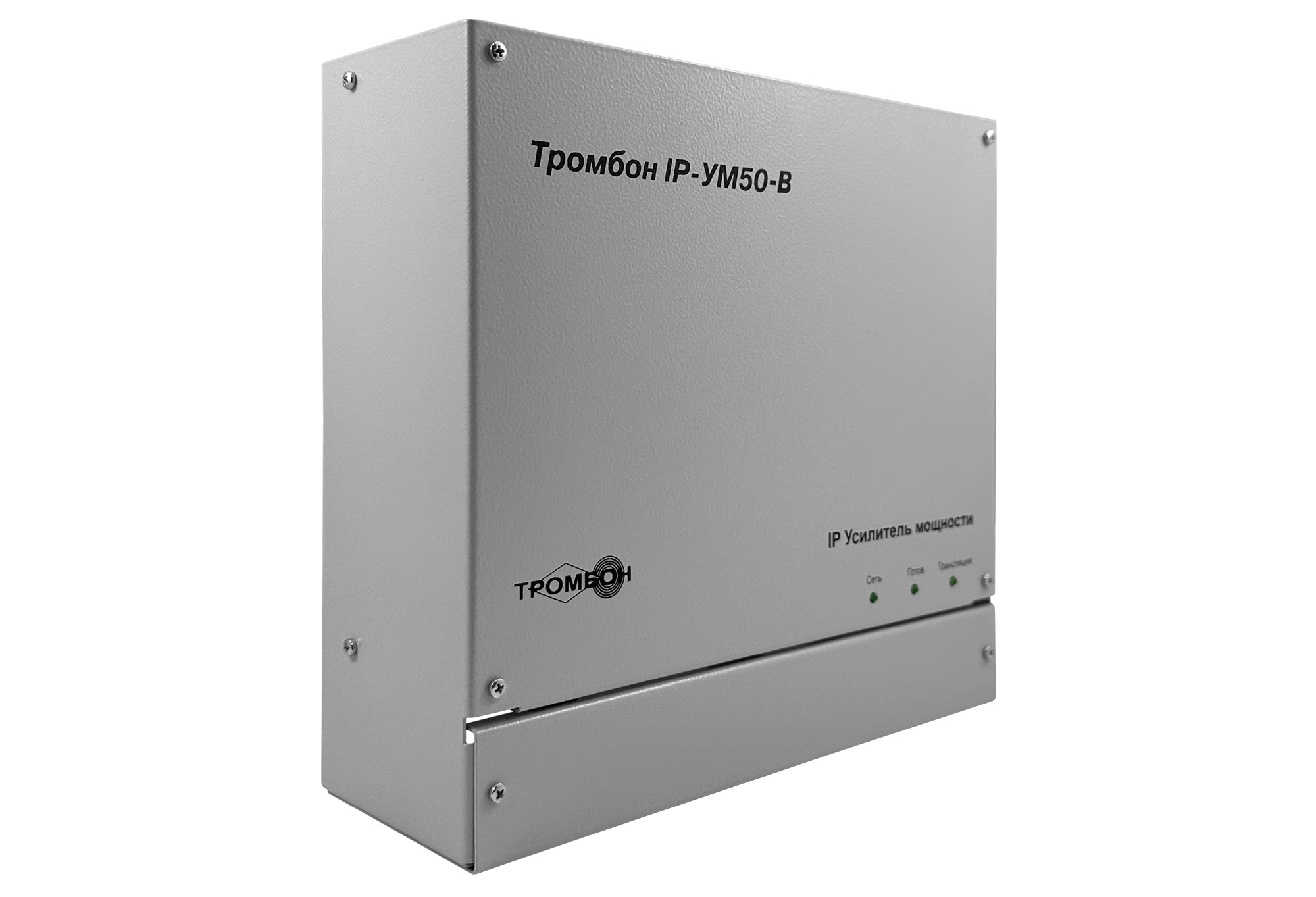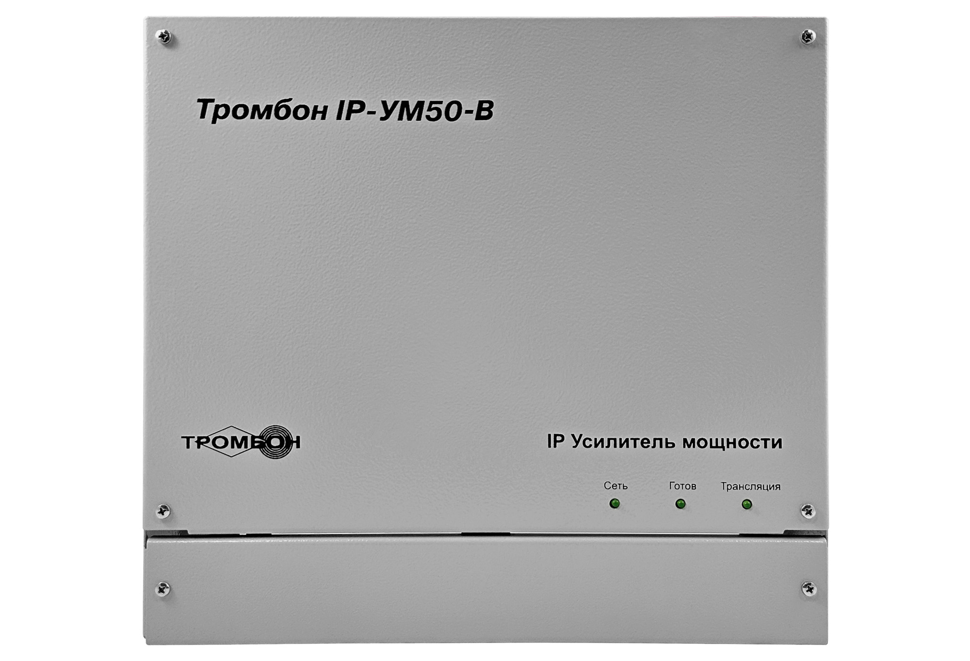 Усилитель мощности «Тромбон IP-УМ50-В» предназначен для работы совместно с пультом звукового вещания «Тромбон IP-ПЗВ», блок оповещения «Тромбон IP-БО8» и модуль сопряжения с каналами связи МЧС «Тромбон IP-МЧС». Усилитель мощности предназначен для приёма голосовых, звуковых, тревожных и иных сообщений от пультом звукового вещания «Тромбон IP-ПЗВ», блоков оповещения «Тромбон IP-БО8» и модулей сопряжения с каналами связи МЧС «Тромбон IP-МЧС», декодирования, усиления и воспроизведения на оконечные устройства – речевые оповещатели.