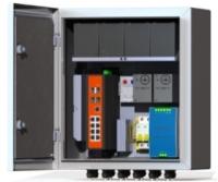 Узел доступа: шкаф с нагревателем, c ИБП с крепежом для АКБ; коммутатор 8 портов, uplink 2 SFP, PoE 802.3 af/at, настенное крепление, входное напряжение 220 В. Состав: Двухполюсный защитный автомат 6 А (1 шт), Обогреватель 50 Вт (1 шт) , Сдвоенный термостат (1 шт), Блок бесперебойного питания 300 Вт (1 шт), Аккумулятор 12 В, 7 А/ч (4 шт), Промышленный неуправляемый коммутатор 8*PoE 802.3 af/at, 2*SFP (1 шт), Оптический кросс 4 порта SC (1 шт), Гермовводы 4*PG9, 4*PG13,5 (1 комплект). Габариты (внешние): 350 × 400 × 210 мм.