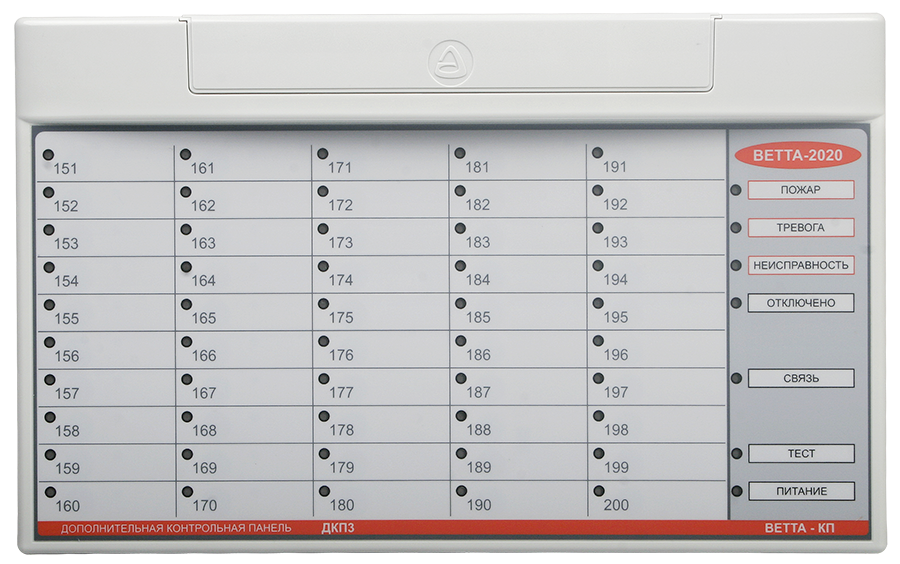 Дополнительная контрольная панель. Обеспечивает контроль до 50-и адресных зон объектовых приборов под управлением панели «ВЕТТА-ОКП». В зависимости от литеры отображают состояние адресных зон с диапазонами адресов 151…200. Питание от внешнего ИП 12 В.
